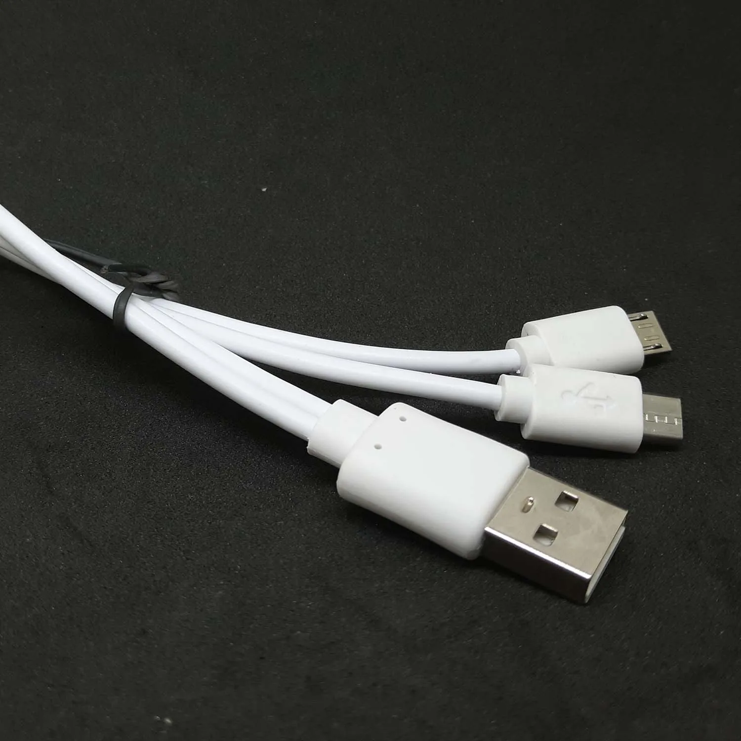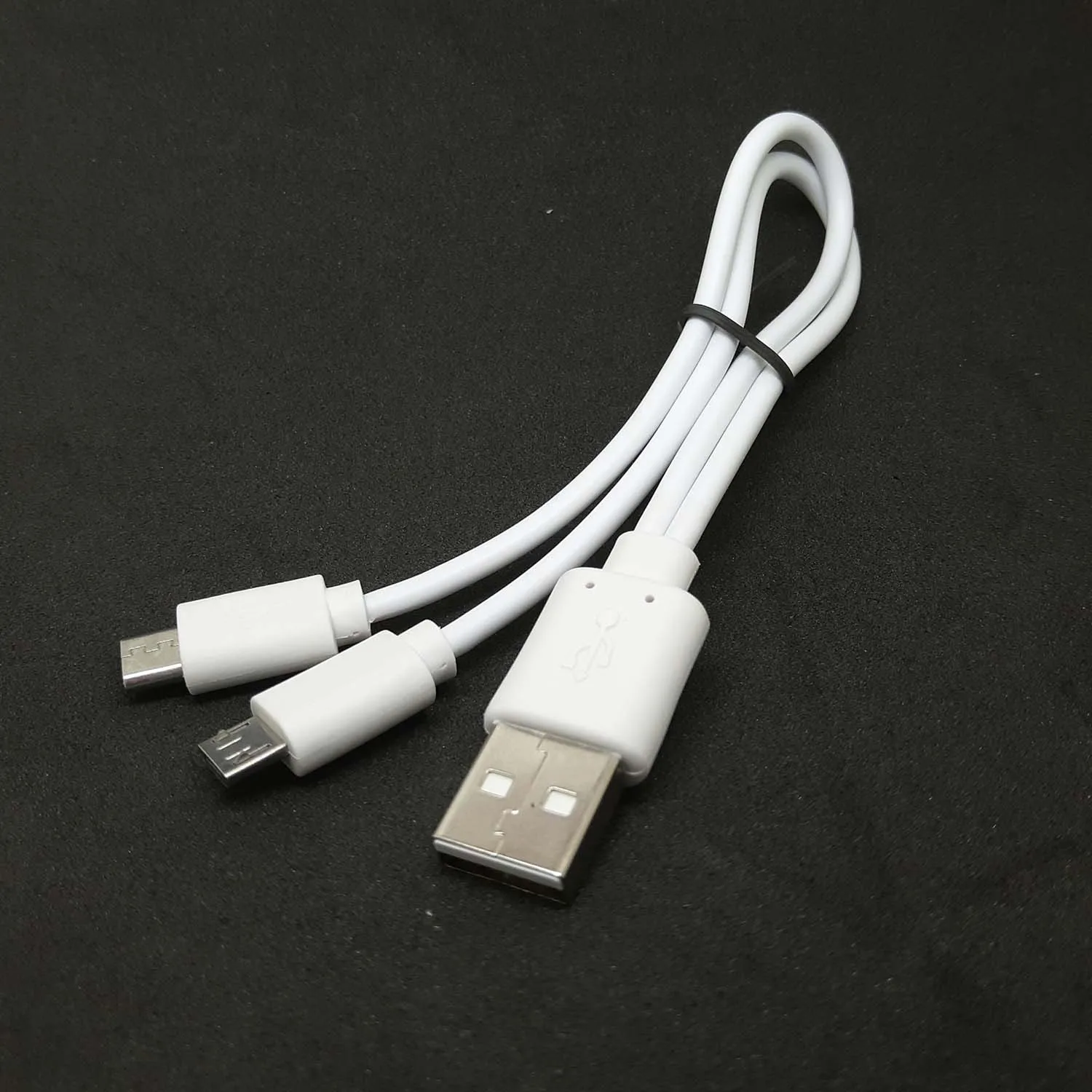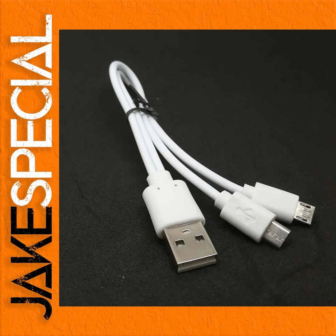 The 20cm USB Male to Dual 2X Micro B Male Y cable offers a reliable solution for charging and syncing power with its USB 2.0 A Male connector and dual Micro B Male connectors, delivering a standard output of 5V at 1A. Designed with a fully shielded and flexible jacket, this white cable ensures durability and longevity. It features hot plug and play functionality, making it compatible with all Micro USB cell phones and tablets. This cable is perfect for quick charging and data transfer, embodying a blend of practicality and modern aesthetic appeal.