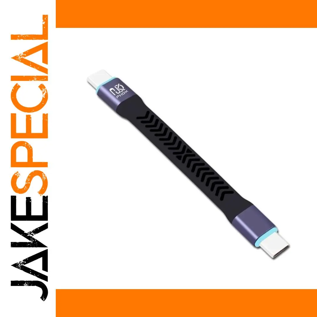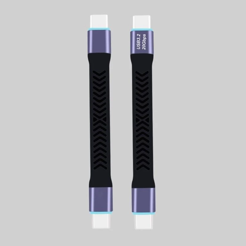 Experience fast and reliable data transfer with this 20Gbps USB 3.2 Type-C cable, measuring 10cm in length with a durable, flat TPE design that offers flexibility and resilience. Equipped with nickel-plated aluminum connectors, it supports high-speed data transmission up to 20Gbps and is rated for a maximum current of 1A, making it ideal for quick charging and data syncing. Tested over 5000 pull-out and bending cycles, this cable promises long-lasting performance. Its sleek black finish, complemented by light blue accent rings near the connectors, combines modern aesthetics with functional durability, enhancing your setup for efficient, high-performance device connectivity.