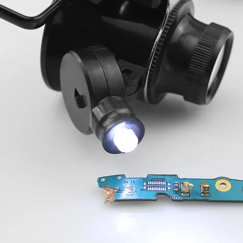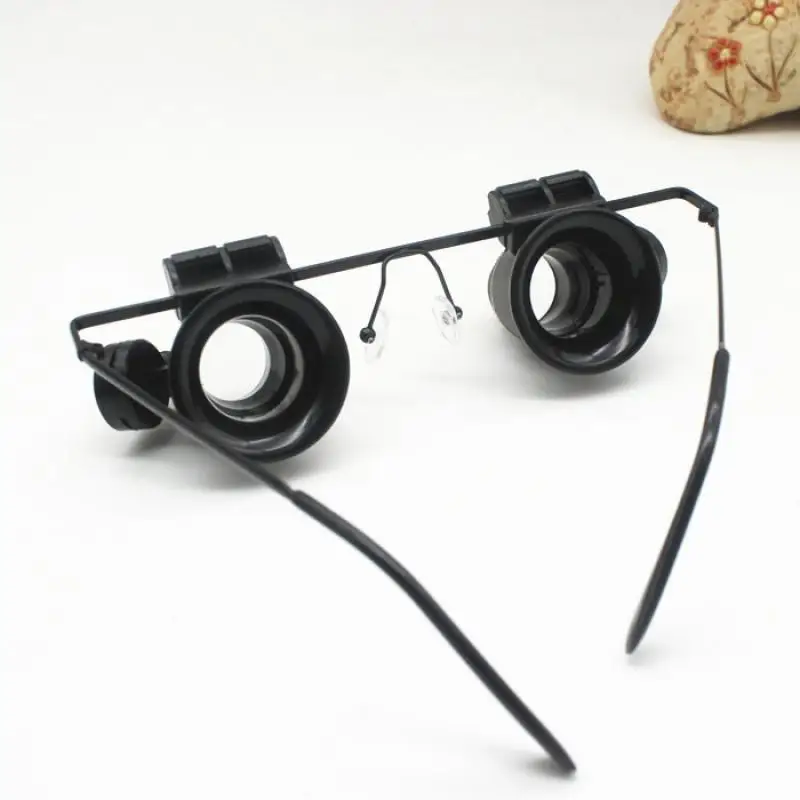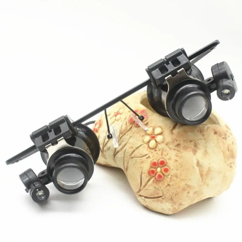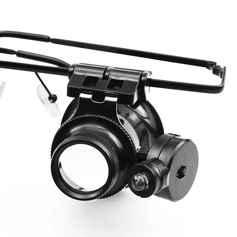 Experience precise watch repair with this modern Dual Glasses Type with LED Light, Model NO.9892A, offering 20X magnification. Crafted from durable, lightweight plastic, these head-mounted magnifying glasses feature circular lenses with integrated LED lights beneath each lens for focused illumination. The adjustable, flexible arms and soft silicone temple tips ensure a comfortable, secure fit during extended use. Designed for professionals, this ergonomic design combines functionality, high clarity, and enhanced visibility, making intricate tasks easier. Whether you choose the version with or without built-in lighting, this stylish and reliable magnifier is your ideal tool for detailed watch management and repair work.