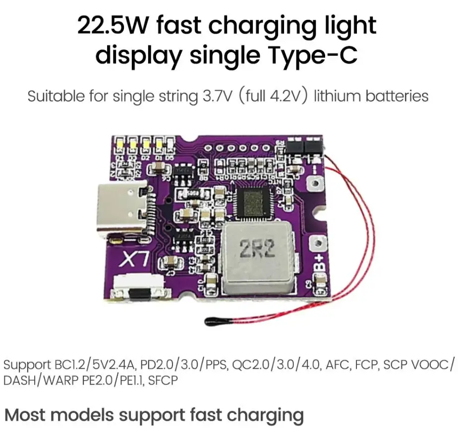 Experience the versatility and efficiency of this innovative 22.5W bidirectional fast charging power bank module. With a sleek purple base, it combines a modern aesthetic with high-tech functionality. Supported protocols such as PD3.0, PD2.0, QC4+/QC3.0/QC2.0, and others ensure broad compatibility with many devices. The digital or light display provides real-time status updates, making it easy to monitor performance. Made from high-quality materials, this compact module delivers a maximum output power of 22.5W, with efficiency ratings up to 96% and charge/discharge efficiency of 95%. Perfect for DIY projects, industrial applications, and portable power setups, it supports parallel lithium batteries like 18650, 21700, and polymer types, ensuring safety and durability for your power solutions.