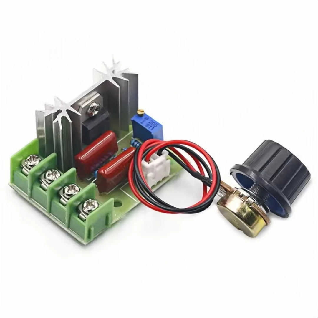 Experience precise voltage regulation with this compact AC 220V 2000W electronic module, designed for dimming, motor speed control, and thermostatic applications. Measuring approximately 5.3 x 4.7 x 2.8 cm and weighing just 43 grams, it features a durable plastic and metal construction. The module offers adjustable voltage control from 50V to 220V AC, allowing you to tailor performance to your specific needs. Its organized layout includes high-power components like a large metal capacitor, heatsink, and a textured black rotary knob with a blue indicator tab for easy adjustments. Perfect for enthusiasts seeking reliable, high-capacity voltage regulation in a compact form.