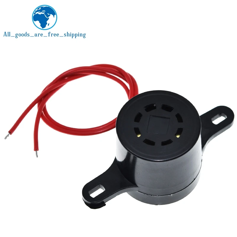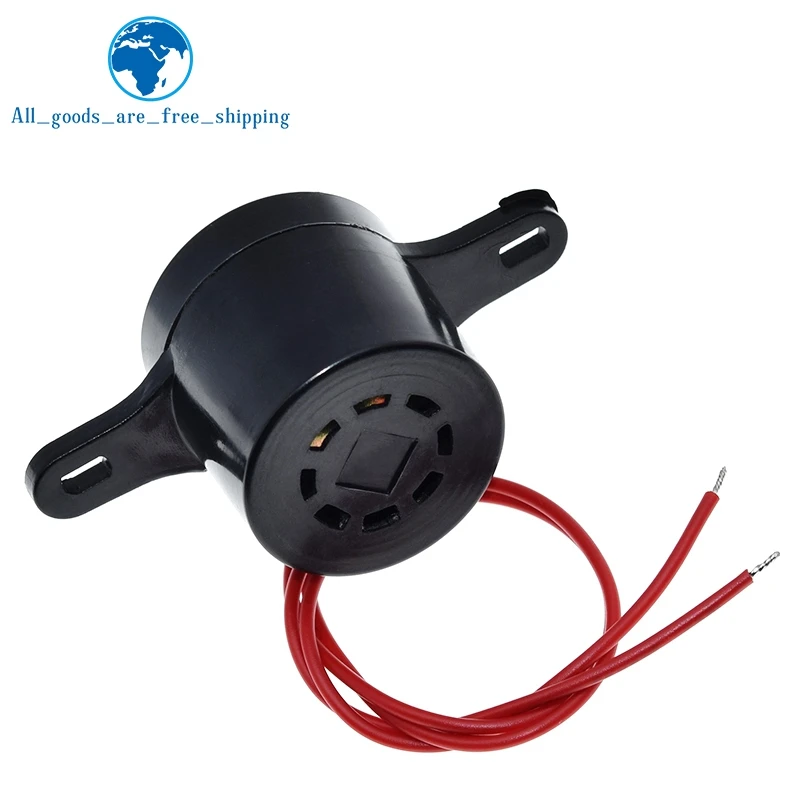 Experience reliable alerting with this sleek, black cylindrical buzzer module, designed for durability and seamless integration into various electronic systems. Its matte finish and minimalist style make it suitable for professional and technical setups. The top surface boasts a series of circularly arranged rectangular and curved vent slots, ensuring loud and clear sound projection of approximately 90 decibels when activated. The small central indentation adds a subtle geometric detail that complements its functional design. Connecting easily via a red wire with a metal terminal, this module offers straightforward installation. Equipped with sturdy mounting flanges, it can be securely fastened to any surface. Its customizable, rugged build makes it a versatile solution for alarms, sensors, and switching applications.