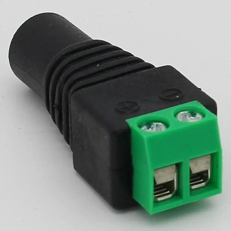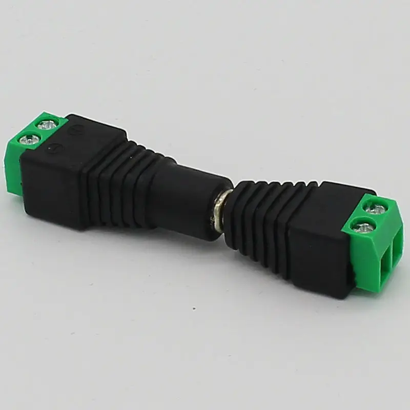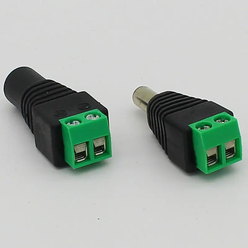 Experience hassle-free power connections with this set of two durable DC jack connectors, ideal for 220V electronic and CCTV projects. Each set includes a female socket with a sleek, polished metallic opening and a black, ribbed plastic body for secure grip. The corresponding male plug features a smooth black body with a protruding metallic pin, also textured for easy handling. Both connectors boast a vibrant green terminal block on top with two screw terminals, facilitating quick, solder-free wire connections. Constructed with high-quality materials, these connectors combine a professional look with lasting durability, providing a reliable link between power sources and devices. Their compact, minimalist design makes installation seamless, empowering you to handle your projects confidently.