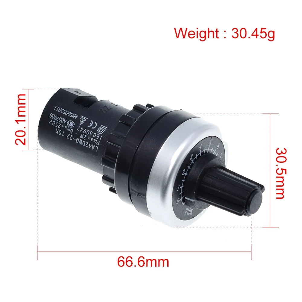 - Features a 22mm diameter cylindrical housing with a textured, gear-like black knob for easy grip and precise manual control.