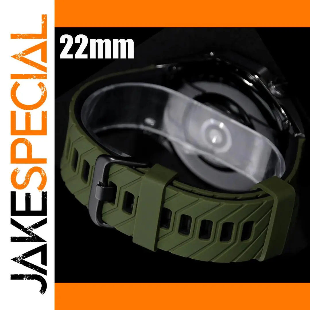 Experience the perfect blend of comfort and durability with this 22mm silicone watch strap designed for Huawei Watch GT6 Pro 46mm, GT5, GT4, GT3, GT2, and compatible models like Amazfit GTR4, GTR3, GTR, Xiaomi S4, S3, and S2. The strap's muted olive green hue and textured surface with angular lines and rectangular cutouts offer a modern, sporty look. Its flexible silicone material ensures a comfortable fit during daily activities or workouts, while the sturdy black matte metal buckle provides secure fastening. The matching green loop keeps excess strap neatly in place, giving you a streamlined appearance. Whether you want a versatile, stylish accessory or a reliable replacement, this strap offers longevity and style in one package.