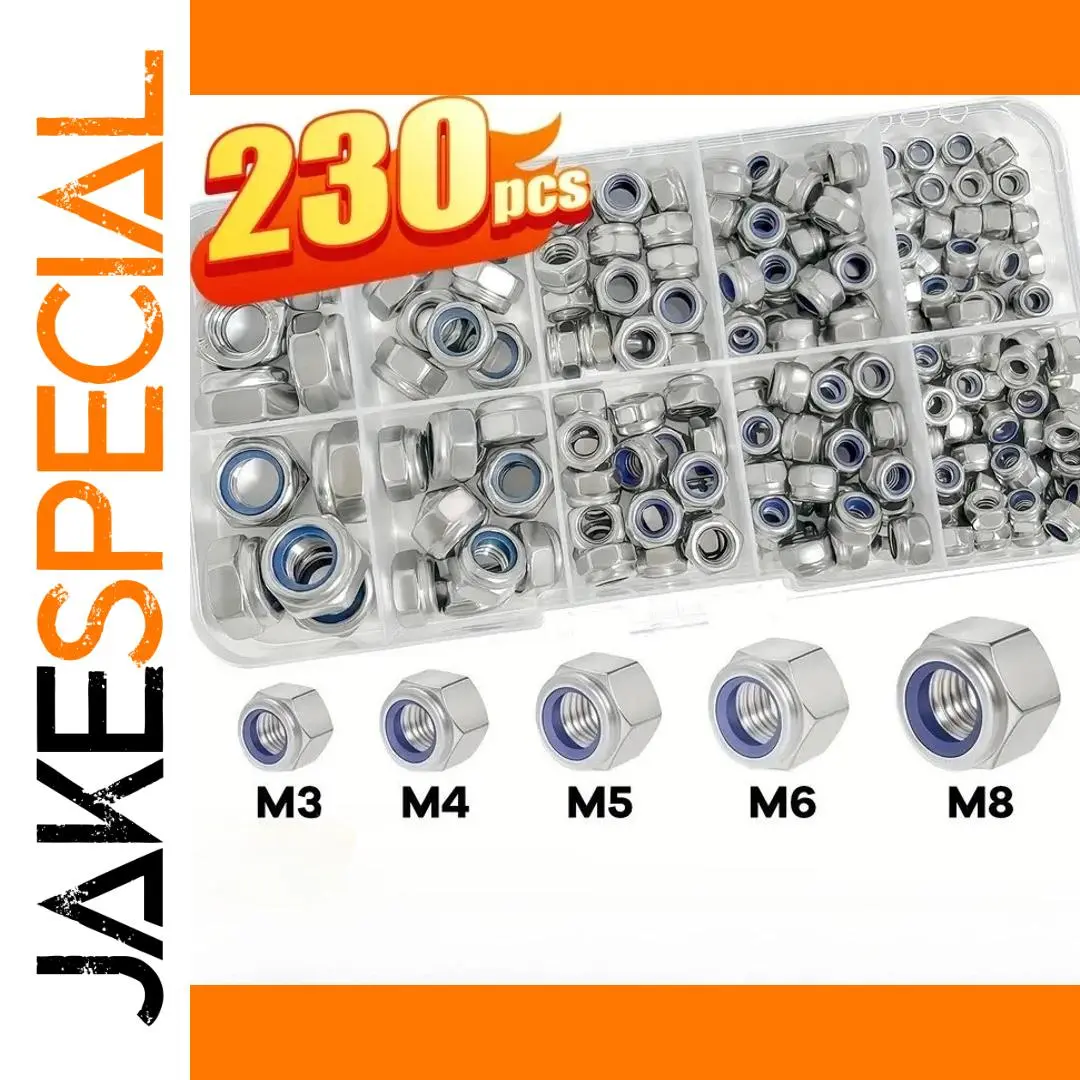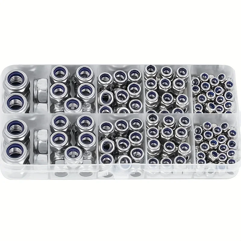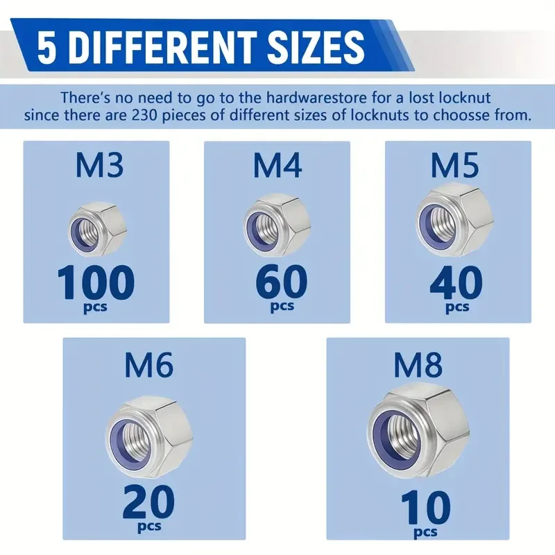 - This set includes 230 stainless steel lock nuts in sizes M3, M4, M5, M6, and M8, offering comprehensive options for various project needs and ensuring compatibility with a wide range of fasteners.