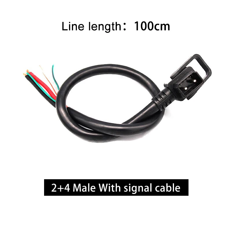 This durable and utilitarian this 2+4/2+0 E-Bike Power Supply Socket set offers a reliable solution for electric vehicle charging and electronic device power connections. Crafted from high-quality black plastic, the sockets feature reinforced mounting flanges for secure installation, while the silver-toned metal contacts ensure safe, efficient conductivity. The design emphasizes robustness and safety, with clean, rectangular shapes and a minimalist industrial aesthetic. Cables come in black cylindrical form, approximately one meter long, with rectangular metallic connectors that are polished for durability. The insulated wires at each end display red, black, and blue colors for easy identification of power, ground, and signal lines. This set combines functionality with a professional appearance suited for demanding lithium battery systems and e-bike applications.