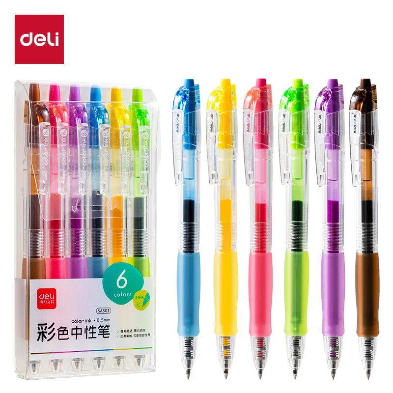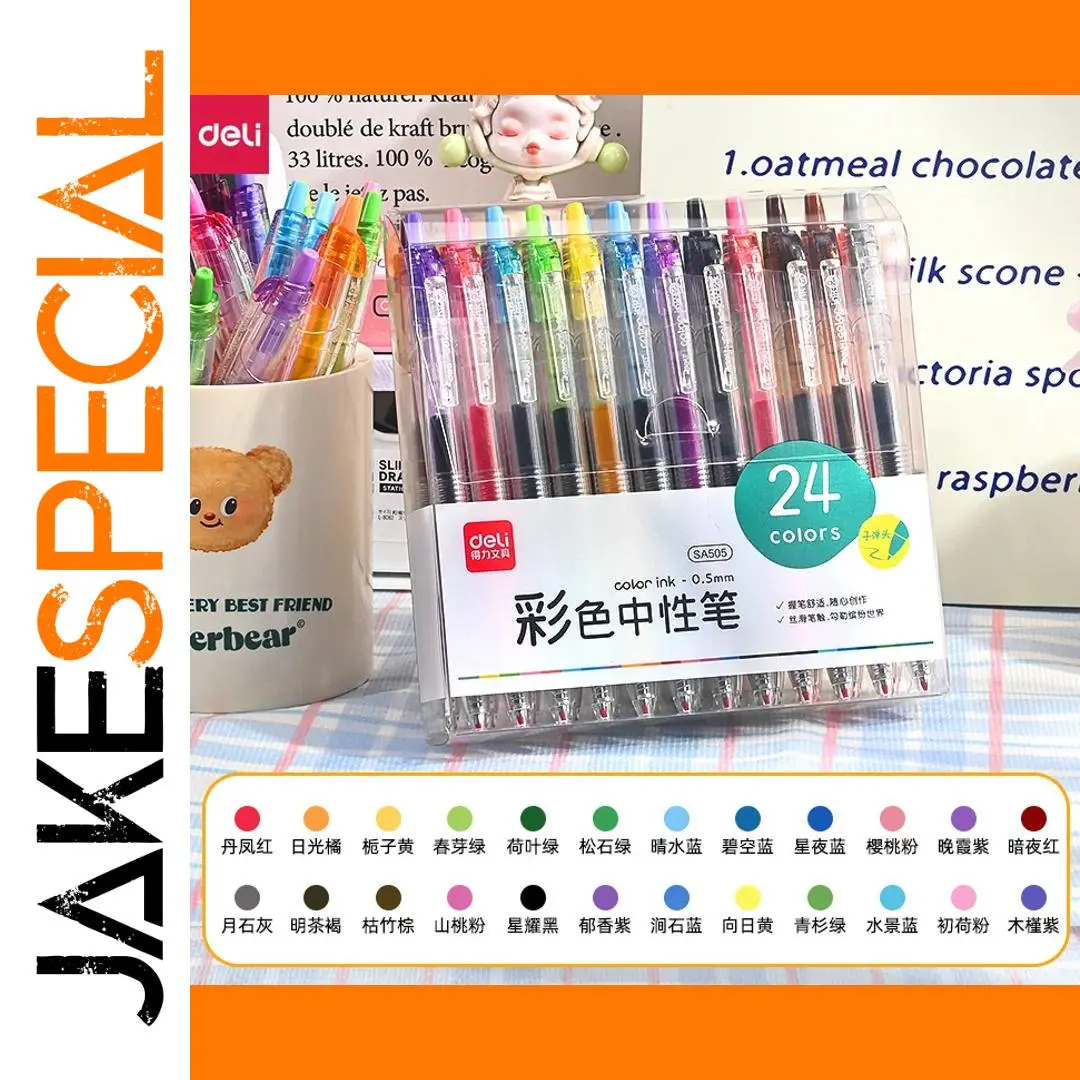Experience the joy of vibrant, smooth writing with this set of 24 Deli gel pens. Designed with practicality in mind, these pens feature a sleek transparent body that showcases a rich spectrum of colors from gentle pastels to vivid, bold shades. The 0.5mm fine tip allows for precise lines, perfect for detailed notes, intricate drawings, or colorful decorations. The press-action mechanism makes these pens easy to use on the go, with retractable tips that eliminate the need for caps and prevent ink drying out. Whether for professional, educational, or creative projects, this set delivers consistent ink flow, quick drying, and smudge resistance. It’s your ideal partner for organizing, illustrating, and adding a splash of color to every page.