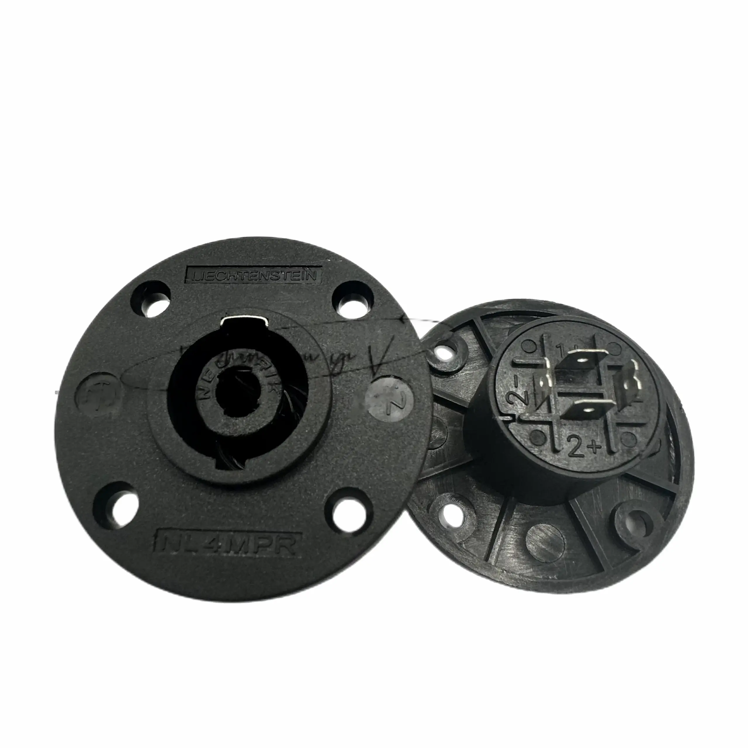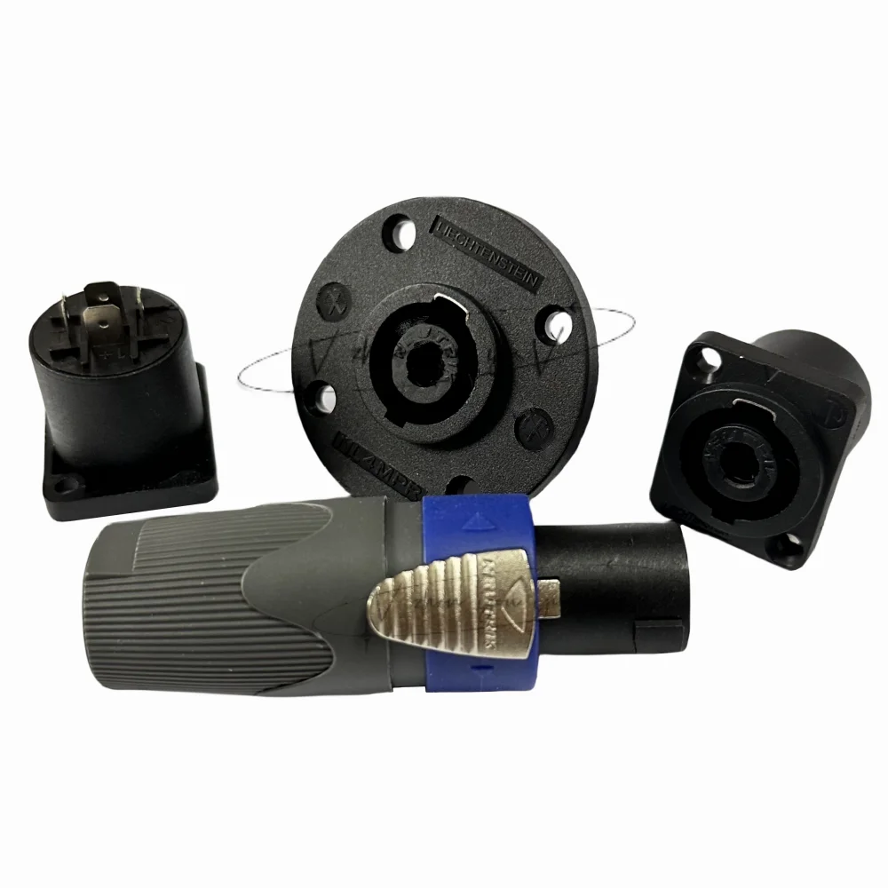 Enhance your professional audio setup with this set of 24 original NL4FX Speakon 4-pole male connectors and base connectors, designed for reliable speaker and amplifier connections. Compatible with models NL4MPR and NL4MP, these durable connectors feature a sturdy black plastic body with precise manufacturing for secure, high-quality connections. The square-shaped connectors include circular openings and mounting holes for easy installation, while the gray textured locking plug with a blue securing ring offers added stability and grip. Rated at 110V and free from hazardous chemicals, this versatile set is ideal for professional audio systems demanding durability, reliability, and professional-grade performance.
