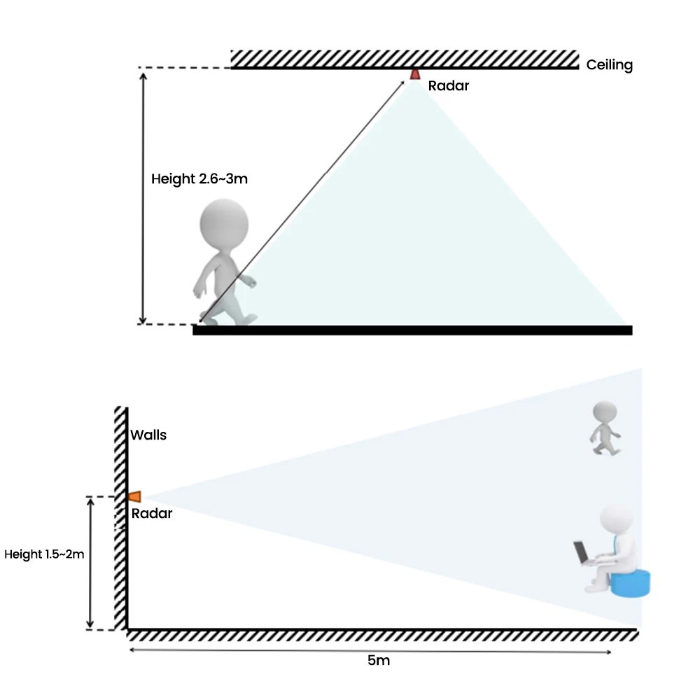 - Supports detection at distances from 0.75m to 6m, with an adjustable sensing range, offering flexibility to suit different spatial requirements efficiently.