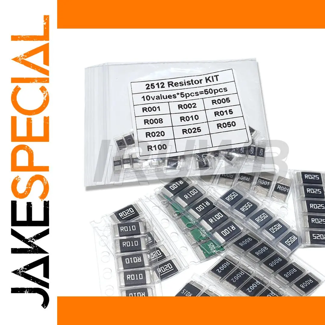 Enhance your electronic projects with this set of 50 high-quality 2512-sized alloy SMD resistors, including 10 resistance values: R001, R002, R005, R008, R010, R015, R020, R025, R050, and R100, with 5 pieces each. Crafted with surface mount technology, these resistors feature a sleek black rectangular design marked with white alphanumeric markings for easy identification. With a 1% tolerance, they provide high stability, excellent self-healing performance, and reliable durability for precision circuitry. Ideal for DIY enthusiasts and professional technicians, this kit ensures you have the essential components for demanding electronic applications, combining accuracy and longevity in a neat, organized package.