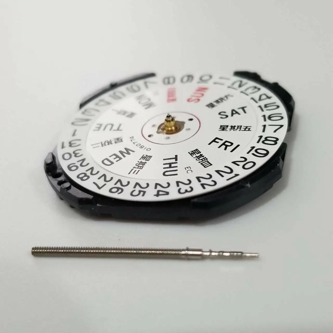 Upgrade your timepiece with this 26.6mm Double Calendar Quartz Watch Movement, designed as a replacement for 7N43A, V343, V348, V743, and Y143 movements. With a compact thickness of 2.98mm, the movement features a white dial with bold black numbers from 1 to 31, and the days of the week displayed in both English and a secondary language, enhancing readability. The hands measure 20mm for seconds, 65mm for minutes, and 110mm for hours, with respective shaft diameters of 0.2mm, 0.65mm, and 1.1mm. Includes an SR920SW battery and a tapered stem (model 351-177 Tap10) for easy installation. Perfect for a seamless repair or upgrade!