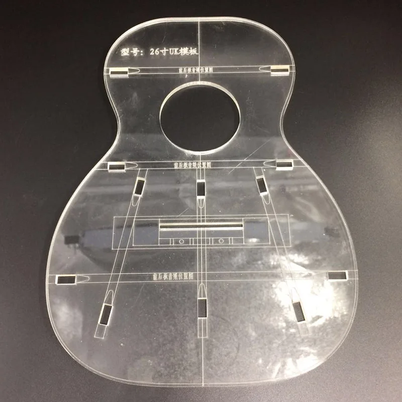 This 26-inch ukulele guitar mold is crafted from durable 5mm thick acrylic, weighing approximately 280 grams. Its transparent design features precise white engraved markings for the sound hole, sound beam placement, and alignment guidelines, ensuring accurate shaping and drilling during construction. The mold is suitable for small four-string ukuleles, offering a non-chemical, reliable tool for guitar making and customization. Its sleek, polished appearance and clear visual cues make it easy to use, while the compact size allows for precise control and professional results. Perfect for enthusiasts and craftsmen seeking quality, accuracy, and ease in ukulele fabrication.
