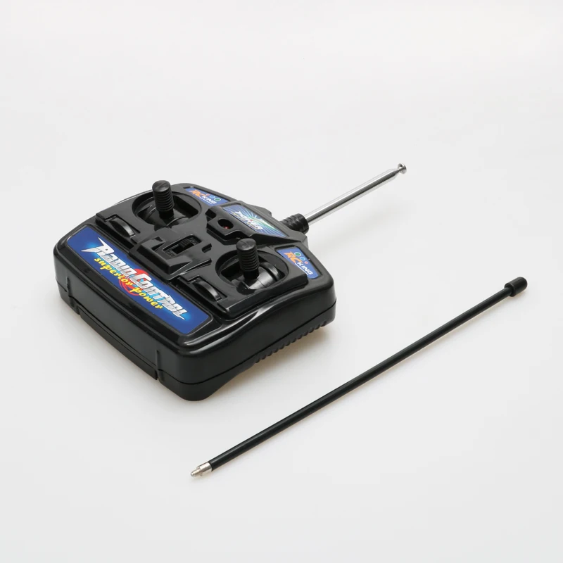 - The remote features a sleek black rectangular shape with a durable plastic housing, decorated with colorful labels, and complemented by a metallic telescoping antenna for extended signal range.