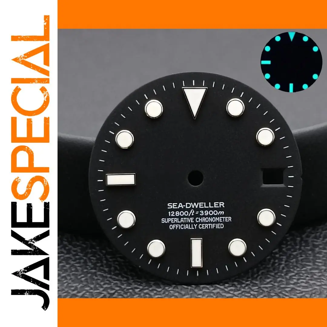This exceptional black watch dial, designed to fit the NH34 and NH35 movements, is crafted with a matte finish that enhances its modern aesthetic. Measuring 28.5mm in diameter, it features luminescent hour markers that glow brilliantly in low-light conditions, ensuring readability at all times. The prominent triangular and rectangular shapes at the 12, 3, 6, and 9 o'clock positions are complemented by smaller round markers, paired with bold luminescent hands for easy time-telling. With the model name “SEA-DWELLER” and impressive depth rating displayed, this dial not only emphasizes durability but also adds sophistication to any watch project you envision.