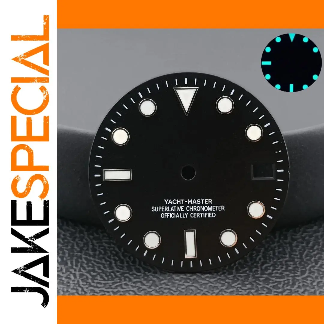This sophisticated black watch dial, crafted specifically for the NH34 and NH35 movements, is a perfect accessory for enhancing the elegance of your luxury timepiece. The glossy black finish gives it a contemporary look, complemented by luminescent white hour markers that provide visibility in low-light conditions. Unique features such as the prominent triangular marker at the 12 o'clock position and the bold “YACHT-MASTER” branding add to its allure. Designed with meticulous attention to detail, this dial not only reflects a nautical spirit but also embodies a timeless style that can enhance your collection.