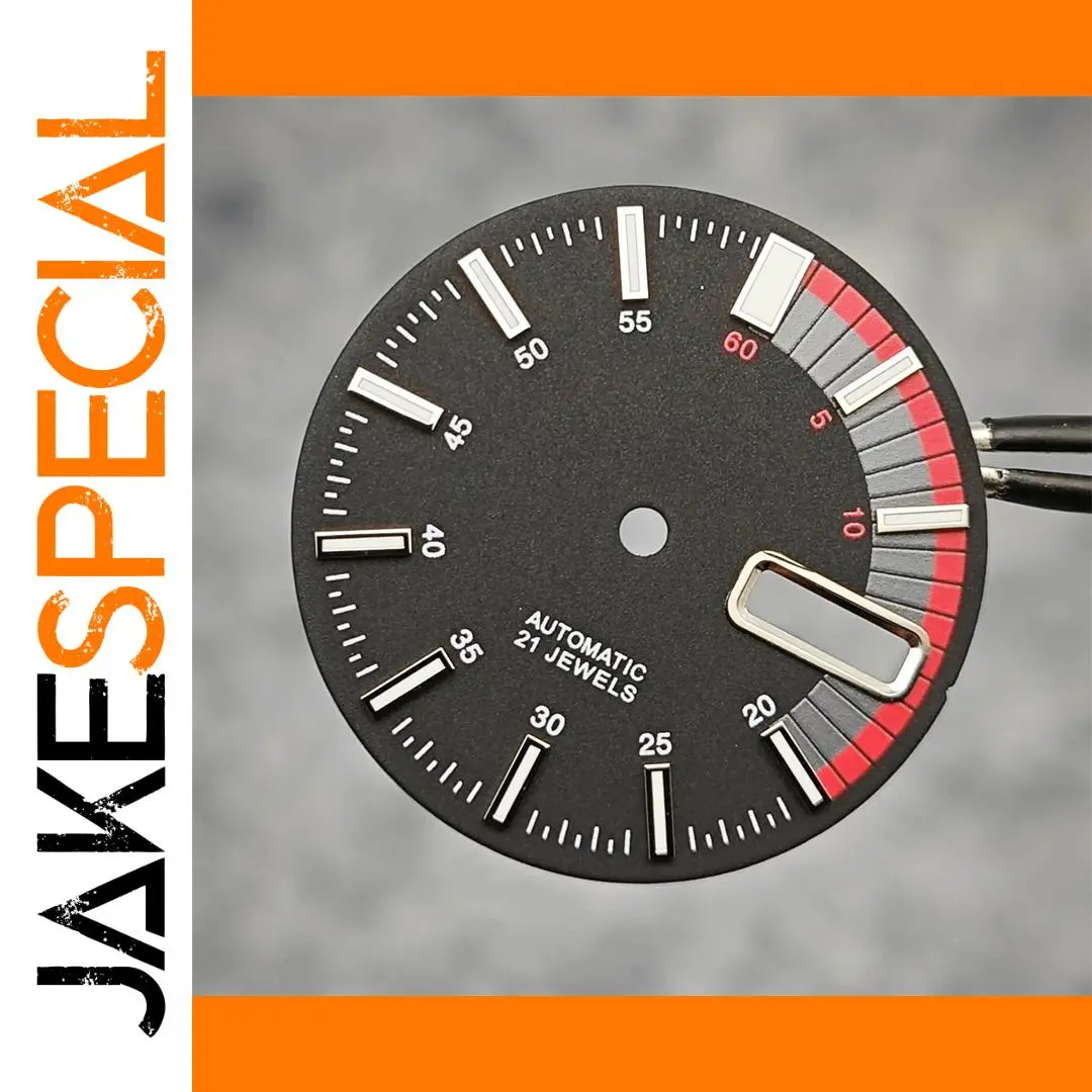 This exquisite black watch dial, measuring 28.5mm in diameter, is designed as a replacement for your Seiko NH36 or 4R35 movements. Its sleek matte finish not only exudes sophistication but also ensures maximum readability with long rectangular hour markers in white and metallic accents. The prominently displayed minute track, highlighted with red segments for the first ten minutes, makes time-checking effortless. With the elegant text “AUTOMATIC” and “21 JEWELS” at its center, this dial reveals the watch's true nature. A rectangular opening caters to functional features, blending utility with style, and ensuring that your watch is not only fashionable but precise.
