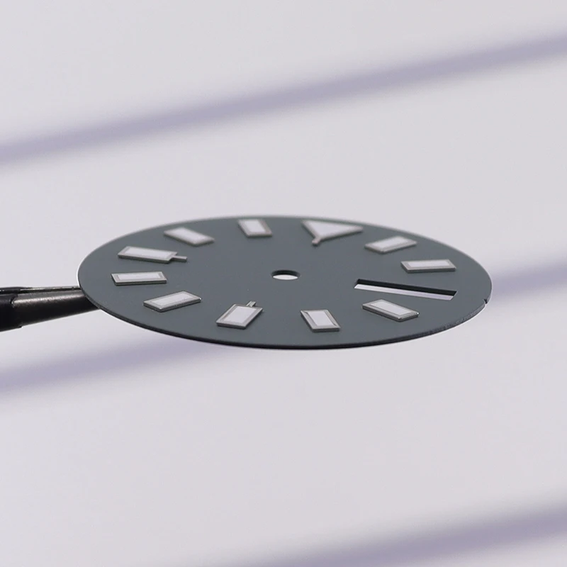 Imagine elevating your watch project with this expertly crafted 28.5mm dial, designed for precise fitting to NH34, NH35, NH36, NH38, ETA 2824, and NH35 movements. The matte gray finish provides a modern, understated elegance perfect for both sporty and luxury watches. Its minimalistic design features applied rectangular indices with luminous inserts, ensuring excellent visibility in low light, while the prominent inverted triangle mark at 12 o'clock acts as a clear orientation point. Made from durable copper, this high-quality dial is lightweight at only 0.03 kg and measures 28.5 mm in diameter with a slim thickness of 0.04 mm, making it an ideal refitting or repair part for high-end timepieces. Its clean design allows for seamless integration into various watch styles, giving your watch a refined, professional look.