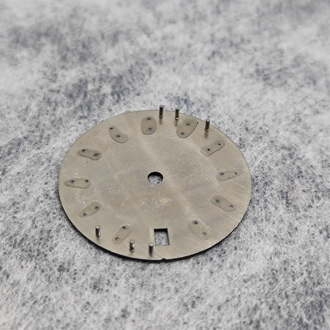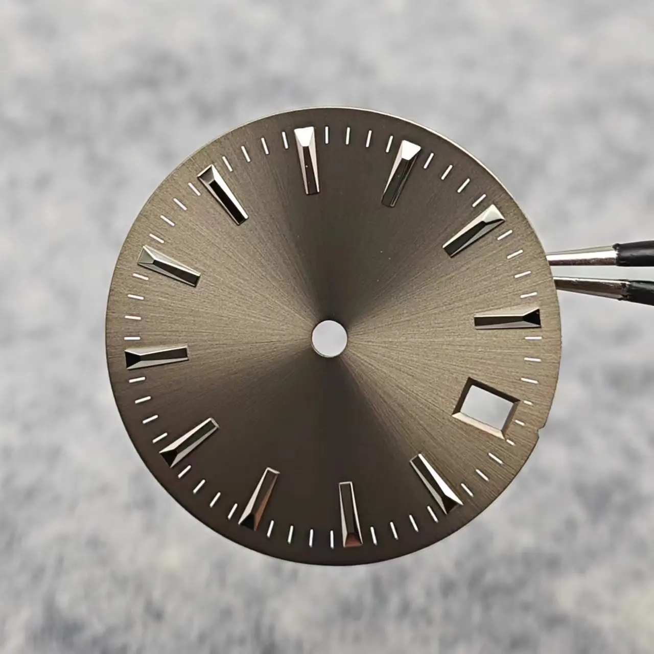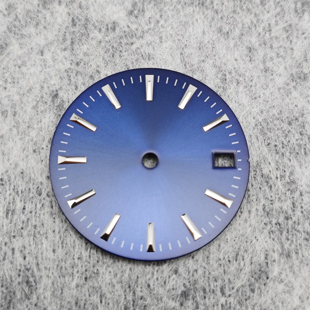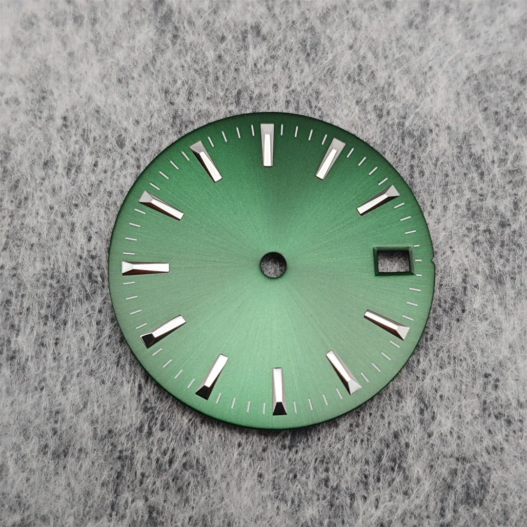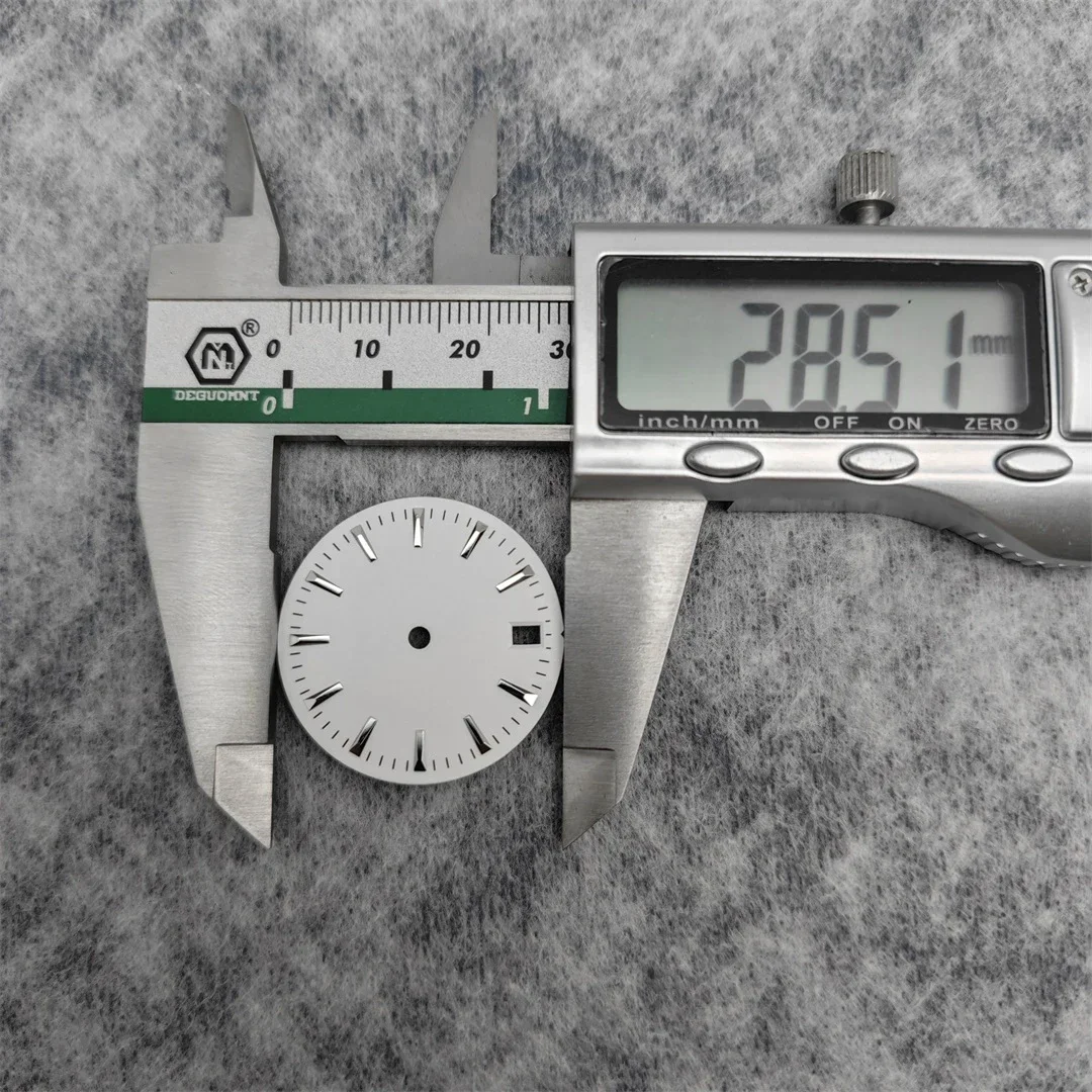 Upgrade your watch collection with this 28.5mm stainless steel dial, compatible with NH35, NH36, 4R, and 7S automatic movements. Featuring a stylish sunburst or frosted white finish, options include vibrant blue, sleek black, sophisticated gray, lively green, and subtle white. The round dial boasts a single-layer design with Arabic numeral markers and riveted applied indices, offering a perfect balance of elegance and casual flair. Designed for women, it supports handle positions at 3, 3.8, and 4.2 o’clock. This new, tag-free watch face adds a distinctive touch to your custom timepiece.