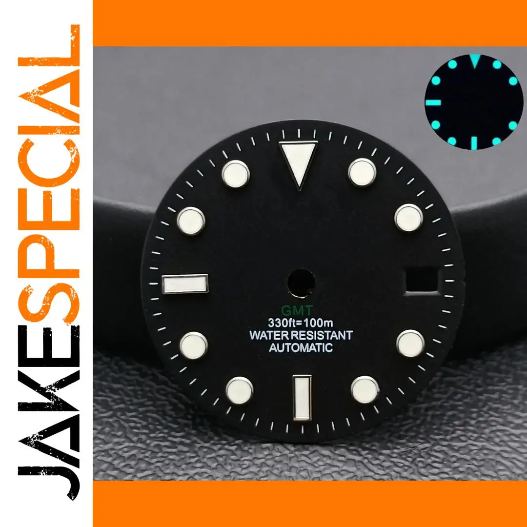 Transform your timepiece with this striking black GMT dial, meticulously crafted for NH34 and NH35 movements. This dial features a minimalist and sophisticated design, making it perfect for sports or diving watches. With luminous hour markers that shine brilliantly in low light, it ensures you can always read the time. The significant triangular marker at the 12 o'clock position adds functionality and style, while the “AUTOMATIC” label signifies its advanced mechanical movement. The eye-catching inscriptions for GMT and water resistance highlight its unique capabilities, making it an essential accessory for watch enthusiasts who appreciate quality and aesthetics.
