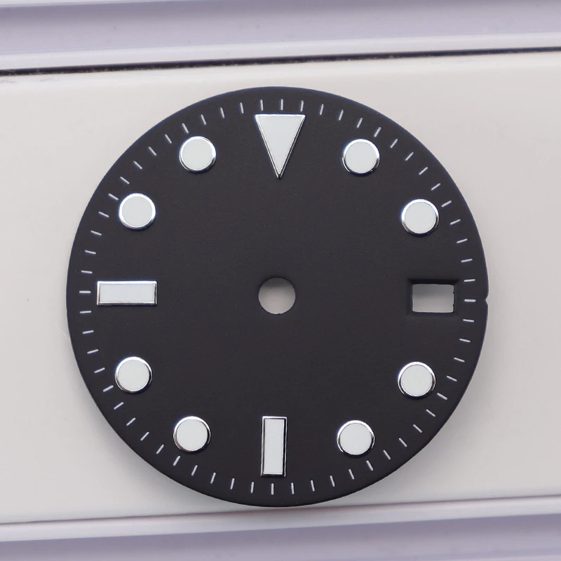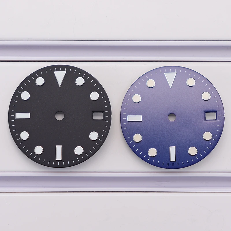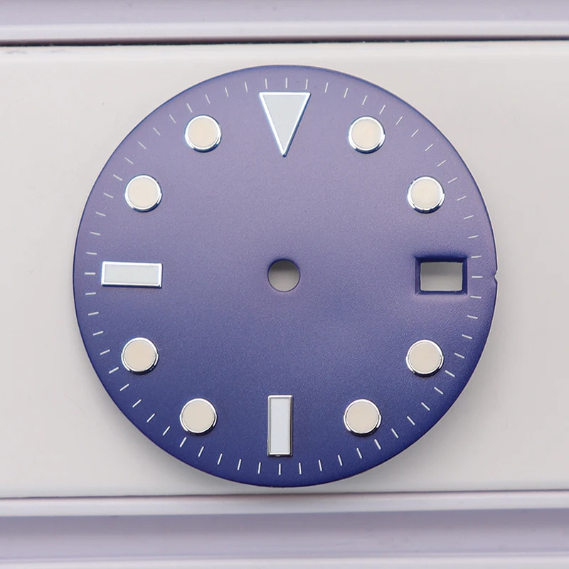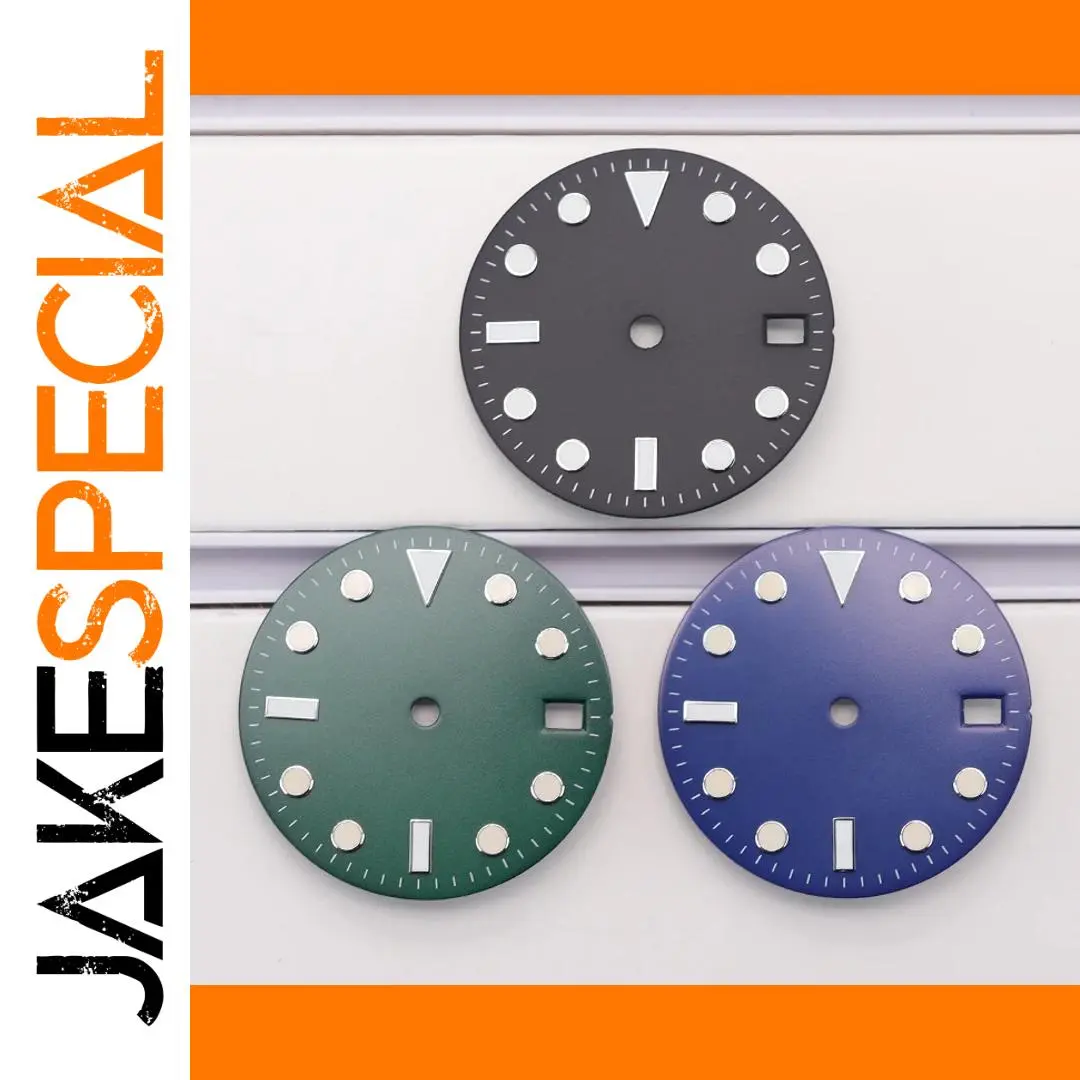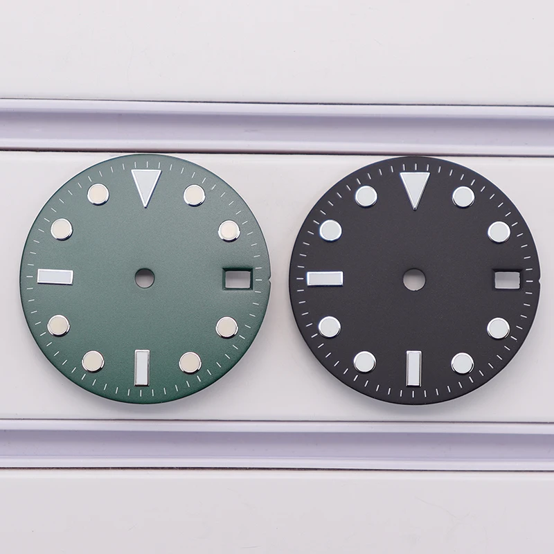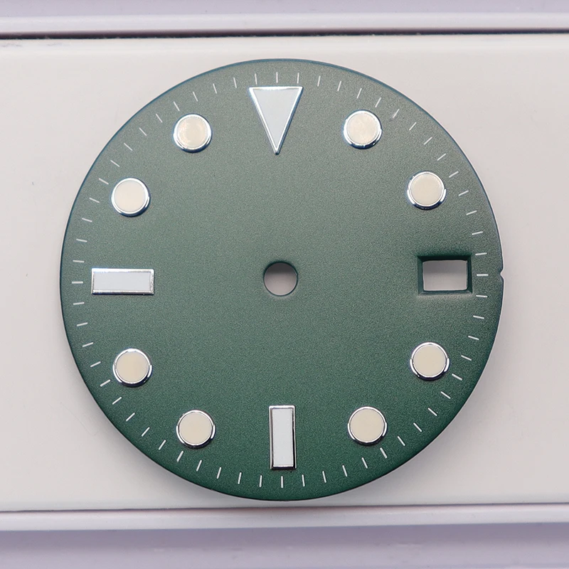 Experience the ultimate customization with this high-quality 28.5mm watch dial, designed for seamless integration into your favorite mod cases like SKX007 and GMT-MASTER. Crafted from durable brass, each dial features a sleek, modern look with a smooth matte finish. Choose from bold black, vibrant green, or deep blue colors, enhanced with C3 green luminous glow for excellent visibility in low light. The minimalist design sports a clear layout with a large triangle at 12 o'clock, rectangular markers at 3, 6, and 9 o'clock, and small circular markers for the remaining hours, complemented by fine minute indicators. Perfect for refitted and custom projects, this dial elevates your watch’s aesthetic while supporting DIY enthusiasts with a minimum order of 100 units.