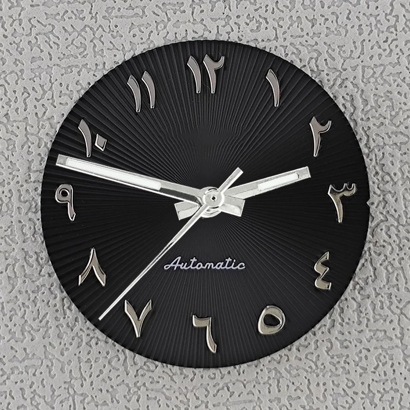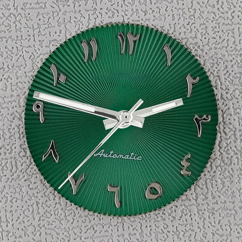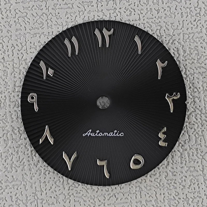 Experience a blend of modern aesthetics and precision craftsmanship with this 28.5mm watch dial designed for automatic watches. Featuring a radial textured surface, it adds depth and visual appeal to your timepiece. The sleek Arabic numerals are finished in a metallic tone, creating a striking contrast against the textured background, making your watch both functional and fashionable. Available in multiple vibrant colors—black, green, white, light blue, and dark blue—you can customize your watch to match your unique style. This dial includes a subtle “Automatic” label and a small “S logo” for branding, ensuring a refined look. Made for enthusiasts who demand quality, it’s compatible with NH35 and NH36 movements, providing reliable performance and timeless elegance.