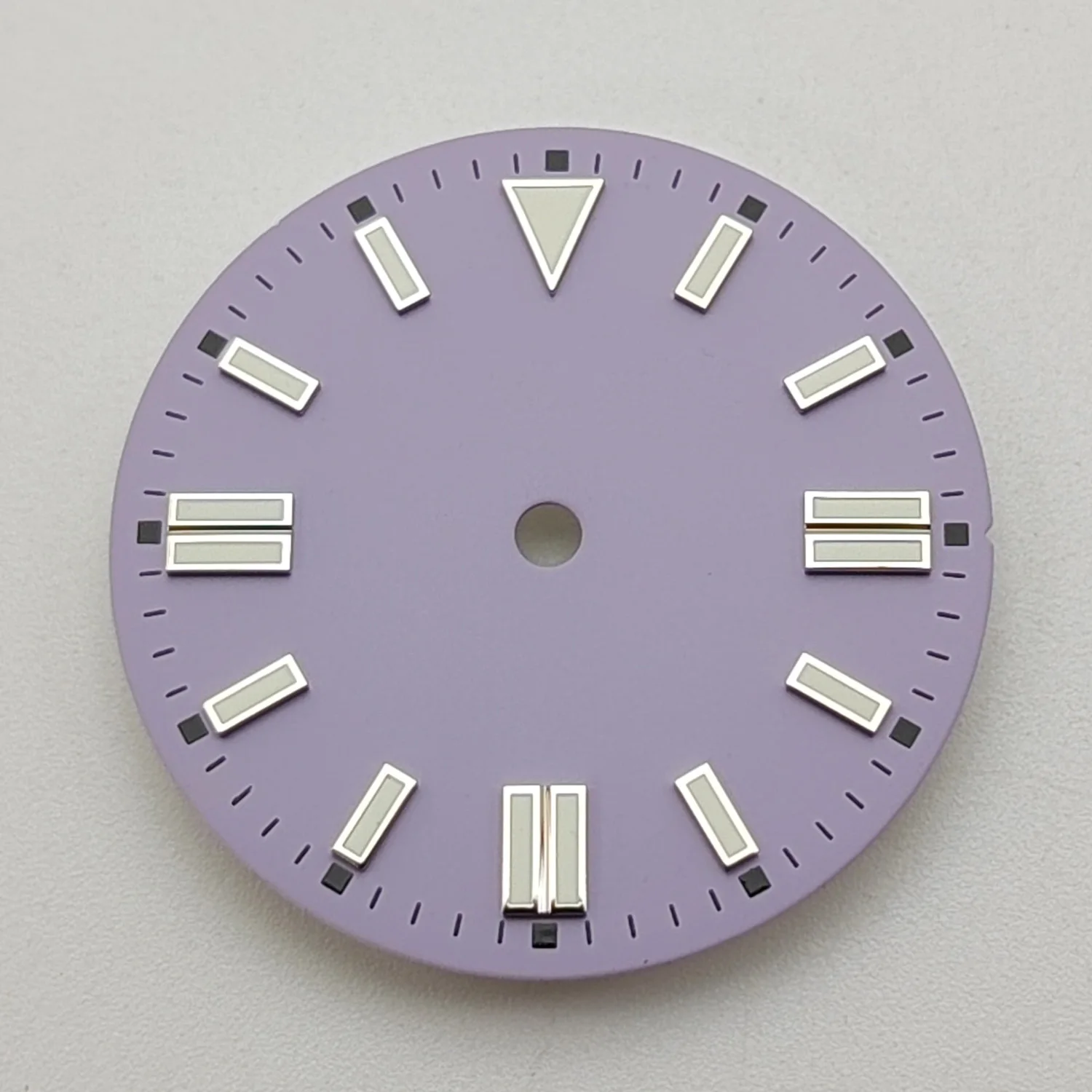 Imagine giving your watch a fresh, modern look with this elegant 28.5mm watch dial from MDNEN. Crafted from stainless steel, it features a smooth matte finish that enhances its minimalist appeal. The colorful palette showcases pastel shades—green, blue, pink, purple, Tiffany blue, and yellow—perfect for creating a casual yet sophisticated style. Its design is sleek and numberless, with raised metallic rectangular hour markers, a bold metallic triangle at 12 o'clock, and tiny black minute markers around the edge, adding subtle detail. This dial is versatile for various wristwatch styles, blending fashion and function seamlessly. Easy to install, it suits many preferences, elevating your watchmaking craft and ensuring your timepiece stands out with a touch of color and elegance.