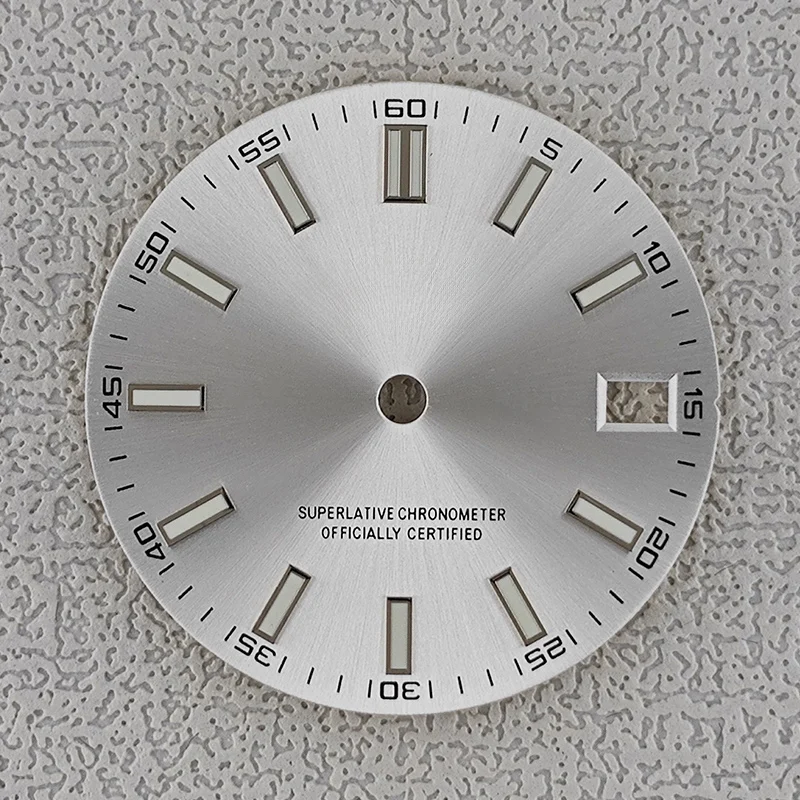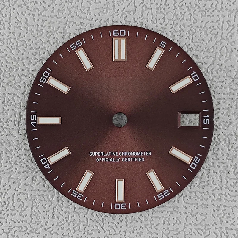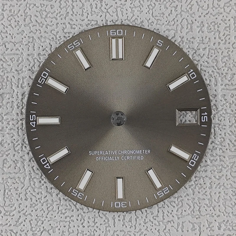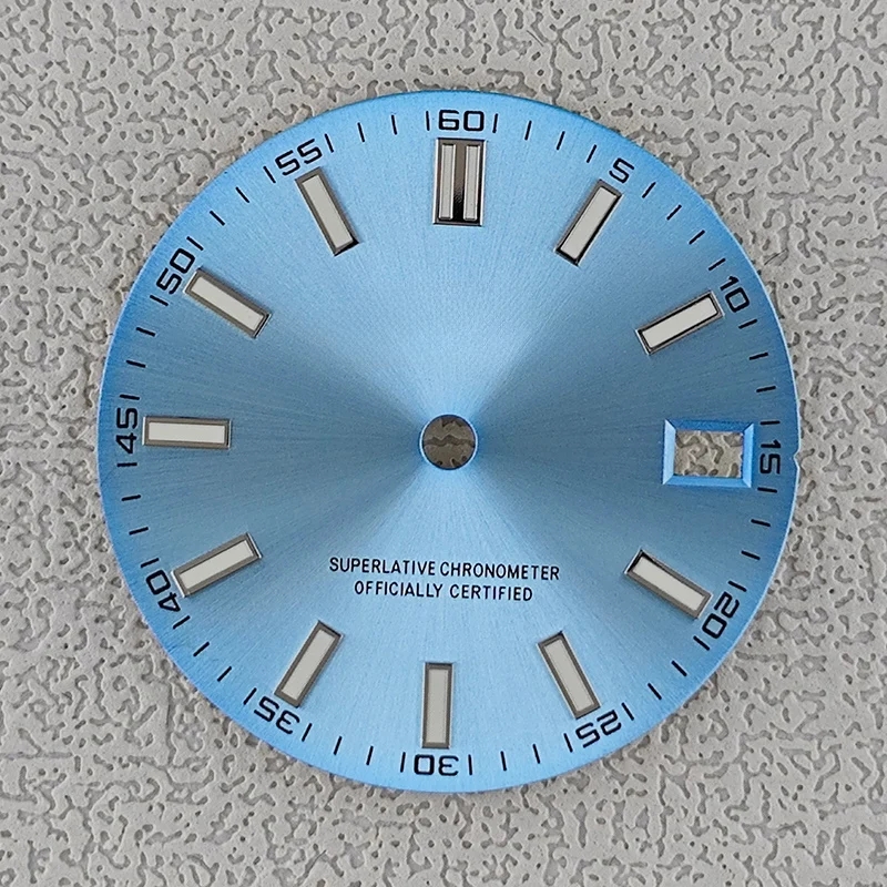 Discover the perfect upgrade for your watch project with this stunning 28.5mm watch dial, designed to bring both elegance and functionality. Its luminous sunray finish radiates outward from the center, creating a dynamic, textured surface that catches and reflects light beautifully, adding depth to your timepiece. Suitable for use with NH35 and NH36 automatic movements, this dial features a clear logo and includes a practical date window at the 3 o'clock position. Its versatile design complements various watch cases, offering both a refined appearance and reliable performance. Whether you're customizing a new piece or repairing an existing one, this dial helps you create a stylish and precise watch.