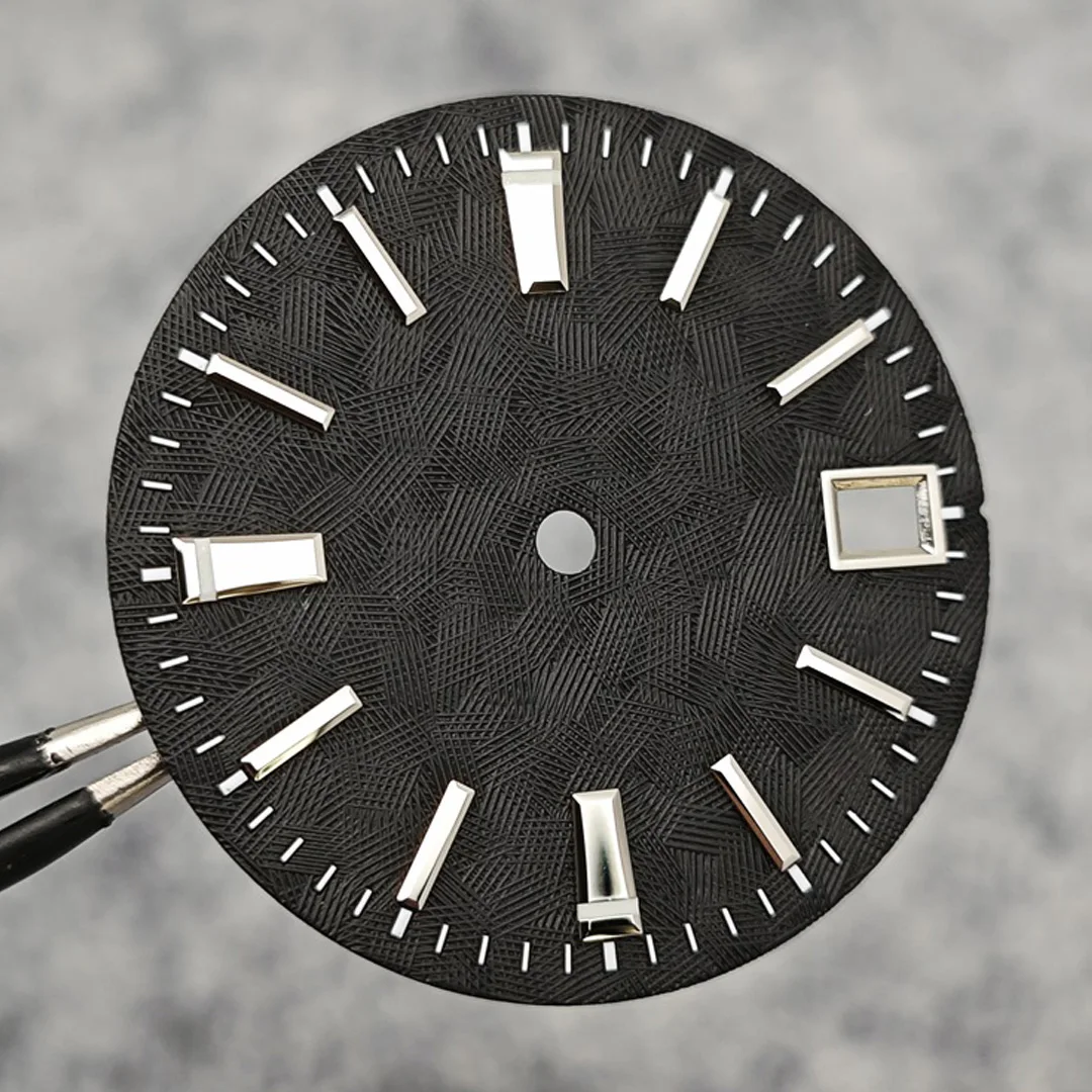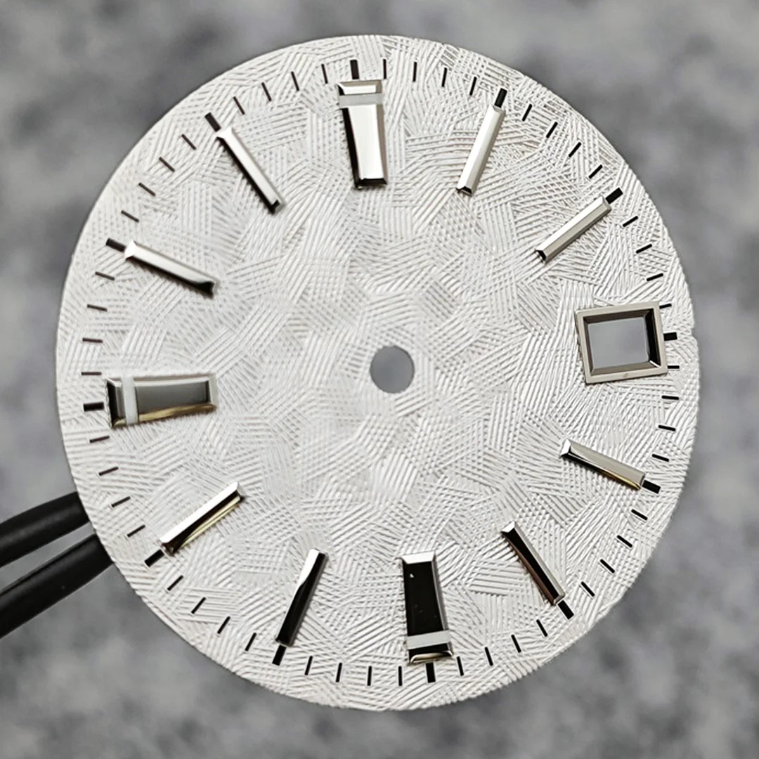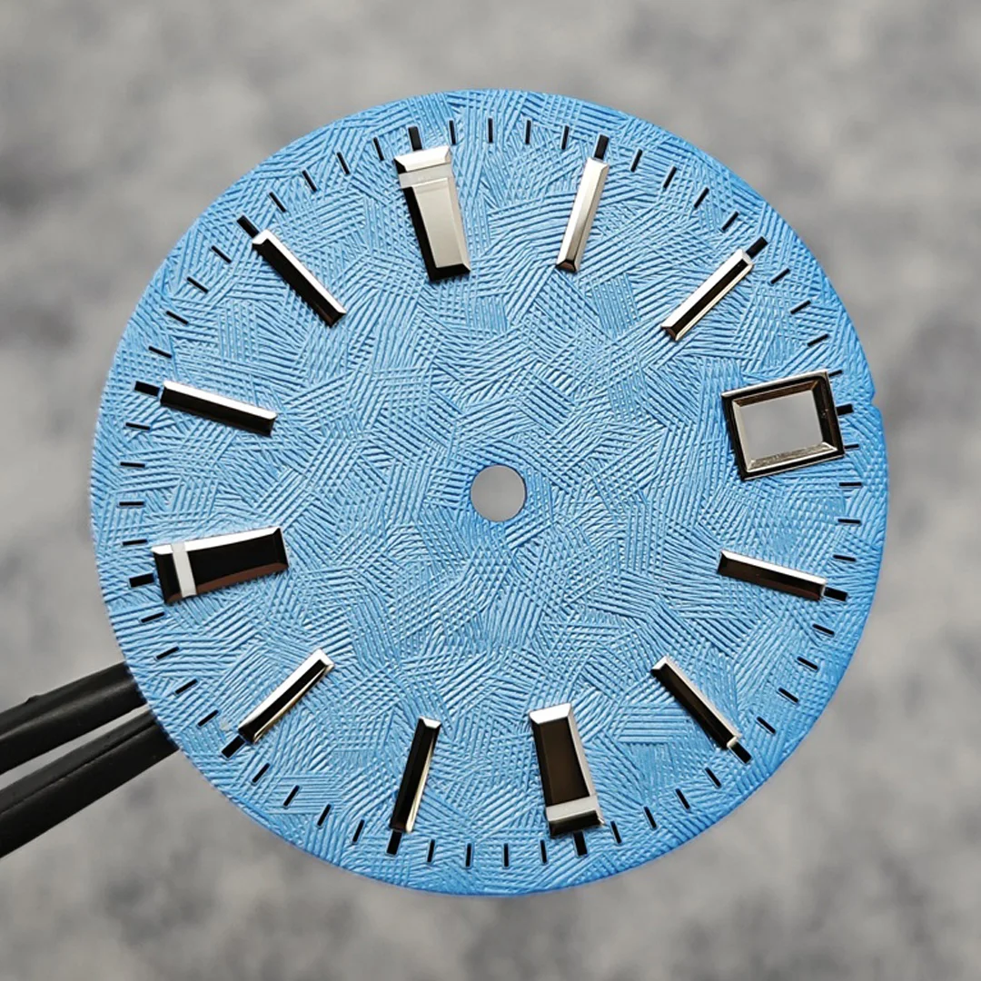 Experience a perfect blend of style and functionality with this MDNEN 28.5mm watch dial. Featuring an irregular textured surface that mimics gentle waves or cross-hatch patterns, it adds tactile appeal to your timepiece. Crafted from stainless steel, this round, numberless dial offers a sleek, matte finish in three versatile colors: black, blue, or white. Its refined design includes prominently raised, polished silver-toned rectangular hour markers at 12, 3, 6, and 9 o'clock, with cutouts for other hours, complemented by fine minute markers around the edge. Compatible with NH35 movements, the dial also boasts BGW9 luminous material that glows softly in low light. Elevate your watch project with this stylish yet functional component.