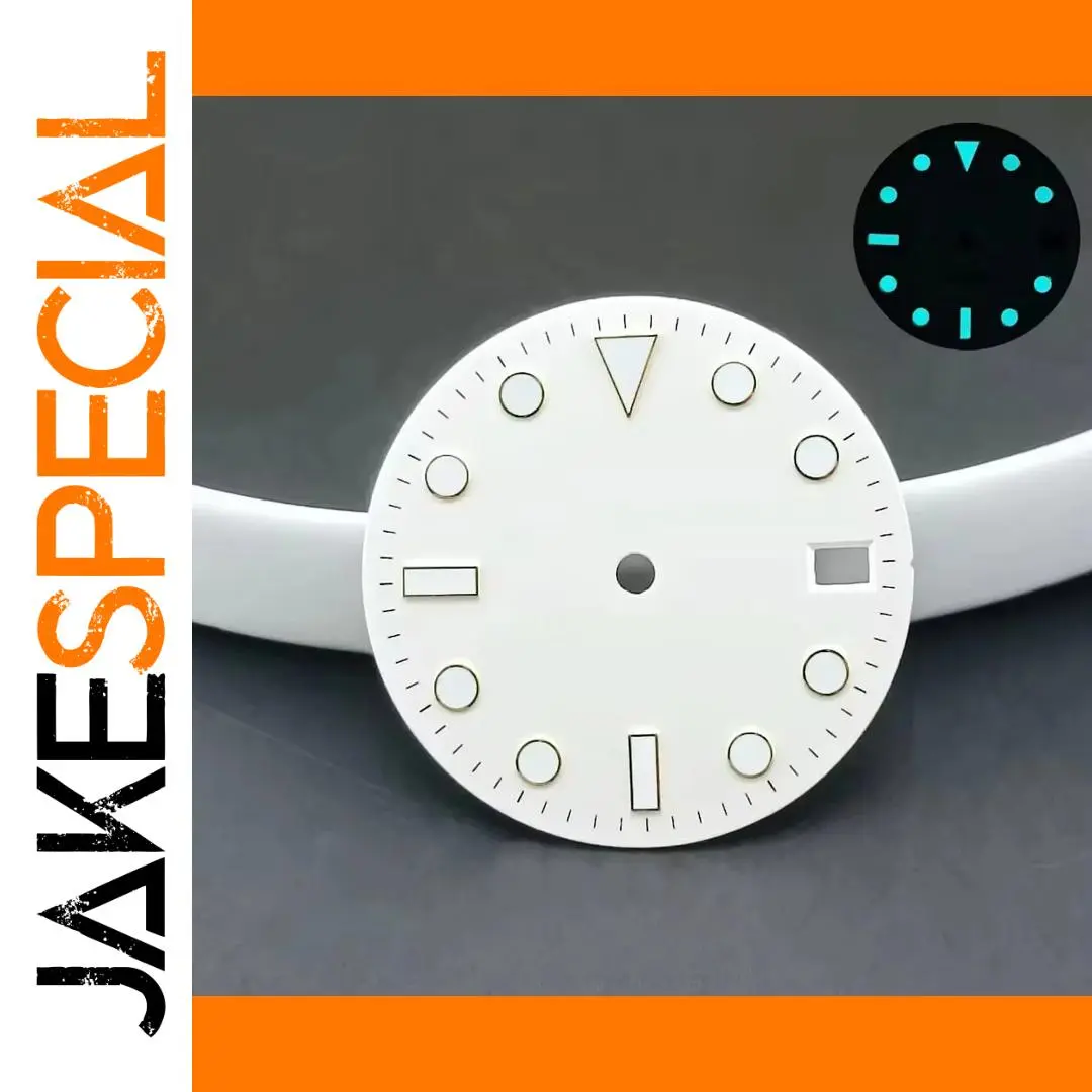 This minimalist watch dial is designed for those who appreciate clean aesthetics and modern functionality. With a diameter of 28.5mm, it is perfectly suited for NH34 movements, making it an ideal choice for your next watch assembly project. The dial features a pristine white background, complemented by subtle hour markers in circular and rectangular shapes. Notably, there's a prominent triangular indicator at the 12 o'clock position, ensuring clear visibility. Luminous elements illuminate the dial in the dark, glowing in a chic blue or teal, elevating its elegance for any occasion.