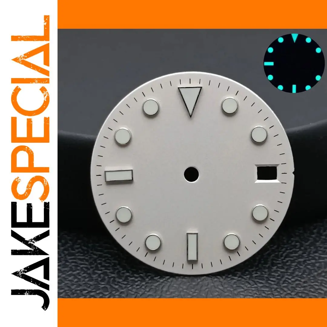 Elevate your watch customization with this sleek 28.5mm GMT watch dial, compatible with NH34 and NH35 movements. Featuring a minimalist design, the metallic silver finish exudes modern elegance, while eight luminescent hour markers ensure enhanced visibility in low-light environments. The prominent triangular marker at the 12 o’clock position, along with rectangular markers at 3 and 9 o’clock, adds both function and style. A subtle rectangular cutout on the right side may accommodate a date display feature. Experience the glow-in-the-dark luminescence, perfect for evening wear. Transform your watch into a statement piece with this stylish and functional dial.
