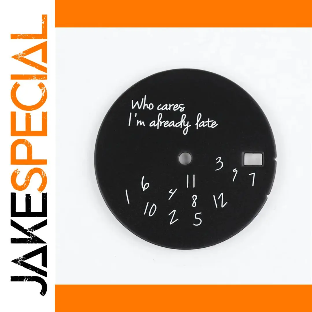 Elevate your watch collection with the Wildfire 28.5mm Watch Dial, featuring the whimsical inscription “Who cares I’m already late” in a playful white script against a sleek black background. This unique dial is designed for NH35 and NH36 mechanical movements, perfect for SKX007 mods. Clear Arabic numeral markers ensure easy readability, while its classic round shape and durable brass material provide a lightweight yet sturdy feel. Visualize this stylish dial enhancing your watch, adding a touch of humor and modernity to your timepiece. Experience the blend of charm and functionality with this one-of-a-kind accessory tailored for enthusiasts.