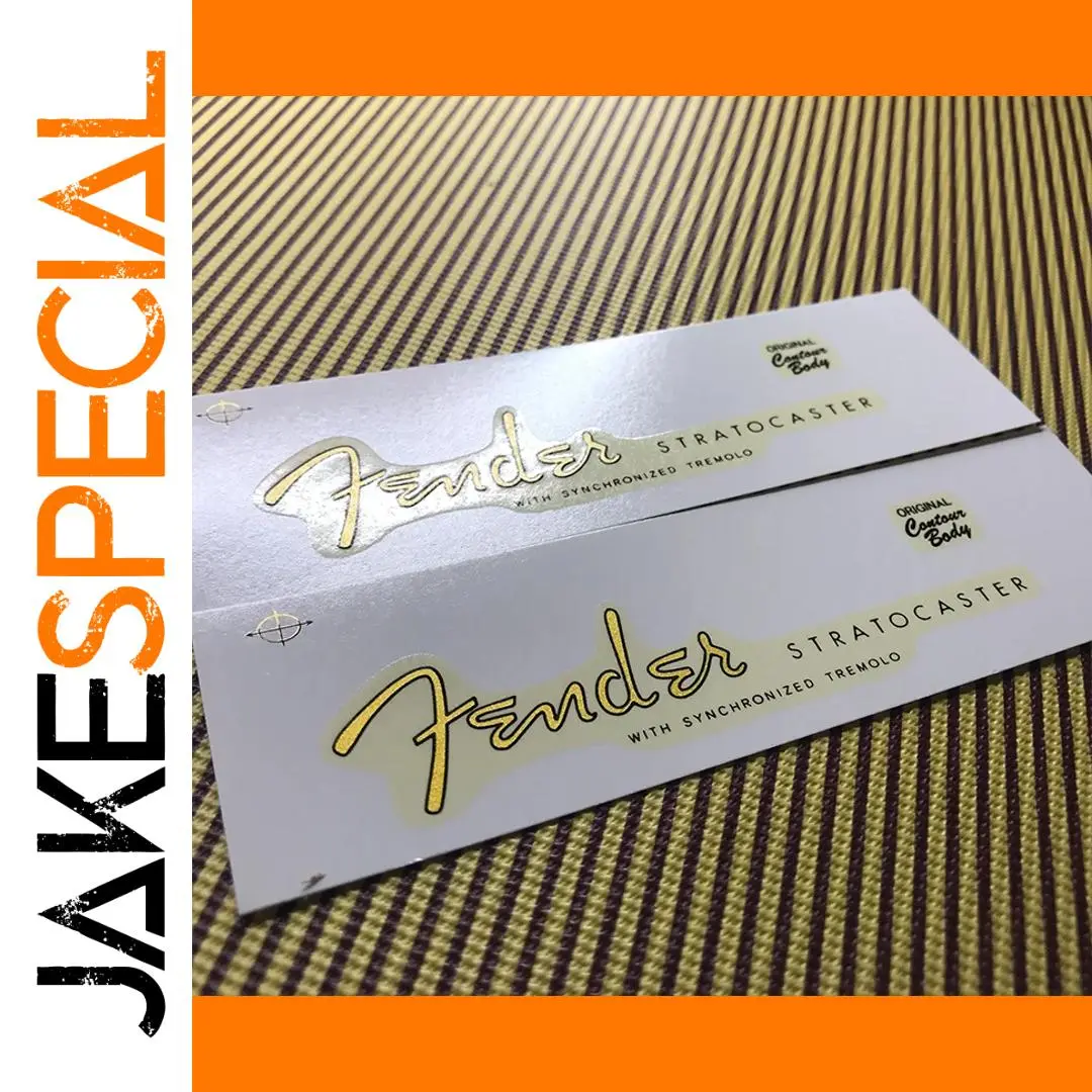 Enhance your electric guitar's aesthetic with this set of two Fender Stratocaster headstock decals. Designed specifically for enthusiasts and collectors, these vintage-themed stickers feature the iconic “Fender STRATOCASTER” logo. Each decal boasts a glossy finish and a stylish cursive font, ensuring a touch of authenticity for your instrument. Imagine applying these decals effortlessly onto your guitar neck—it's a straightforward process that completely revitalizes your instrument's look. The precision in placement is simplified by the unique graphic design. Elevate your musical passion and stand out, whether on stage or in your collection with these beautiful decals.