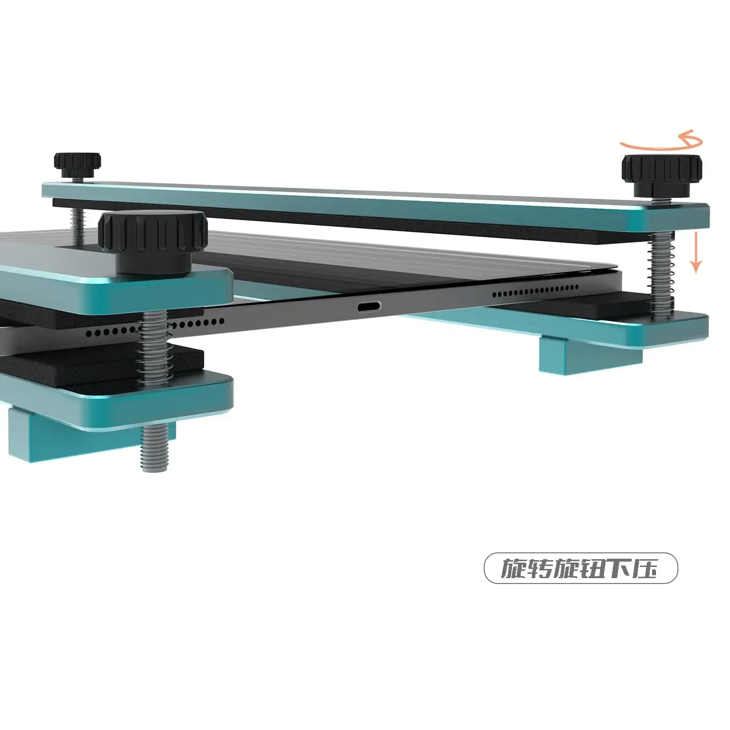 Experience professional-grade screen and back cover repairs with the 2UUL DA02 Universal Screen Fixing Pressing Clamp, measuring 342 x 35 x 57 mm and weighing 1.3 kg. Designed for iPhone and iPad LCD/back glass replacements, this third-generation oversize clamp features a durable, matte teal finish and integrated universal holding pressure for extra-large application. Its robust construction ensures precise, uniform pressure distribution across the surface, making glass repairs more efficient and reliable. With bold black ridged adjustment knobs and engraved markings on the wide pressure bar, this versatile tool provides the necessary stability for seamless device repairs. Visualize yourself achieving professional results with this high-quality, durable clamp.