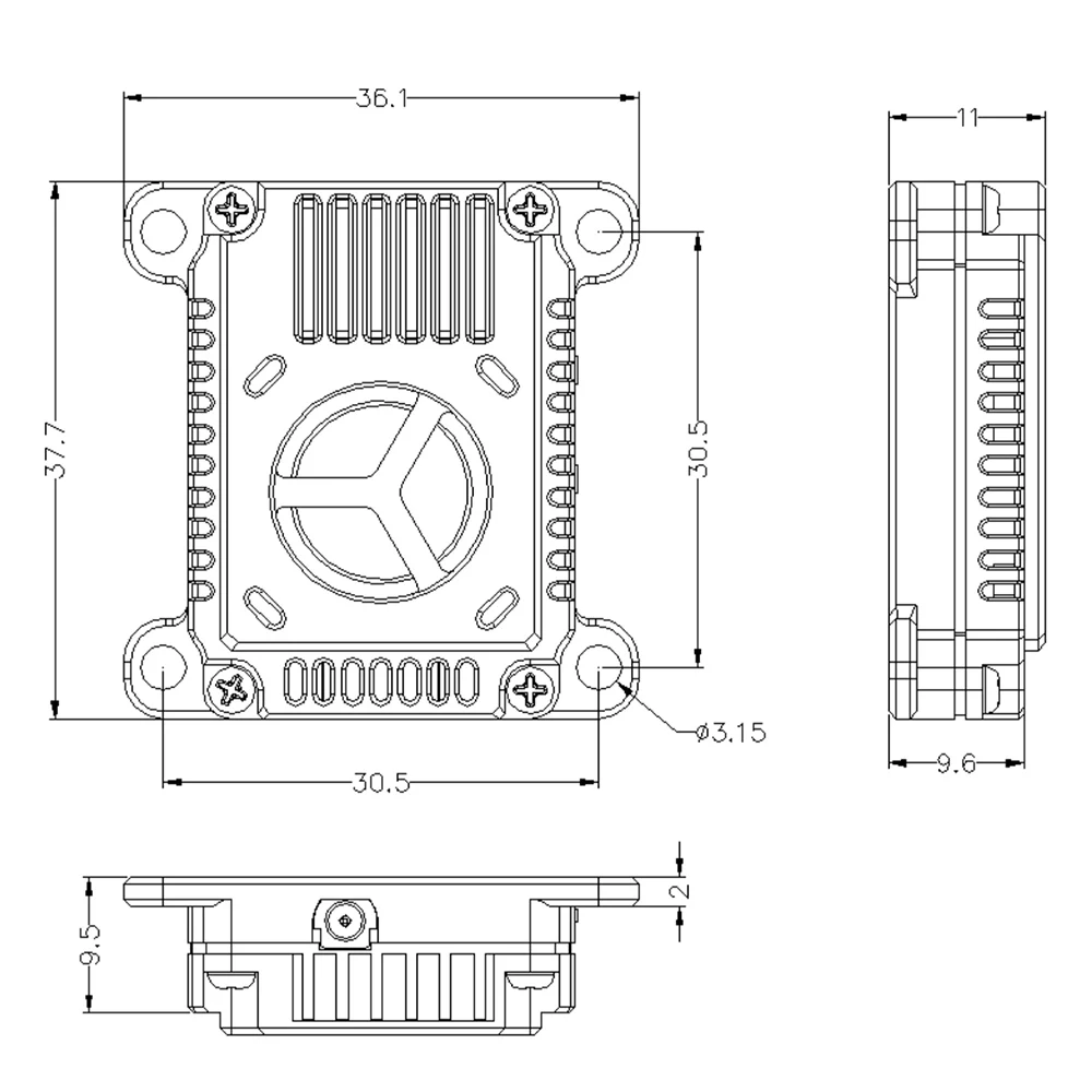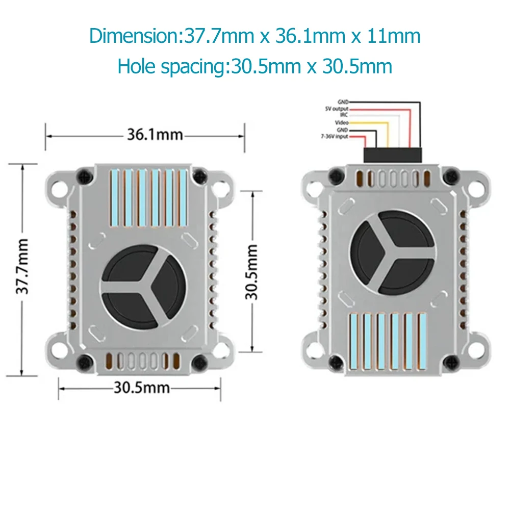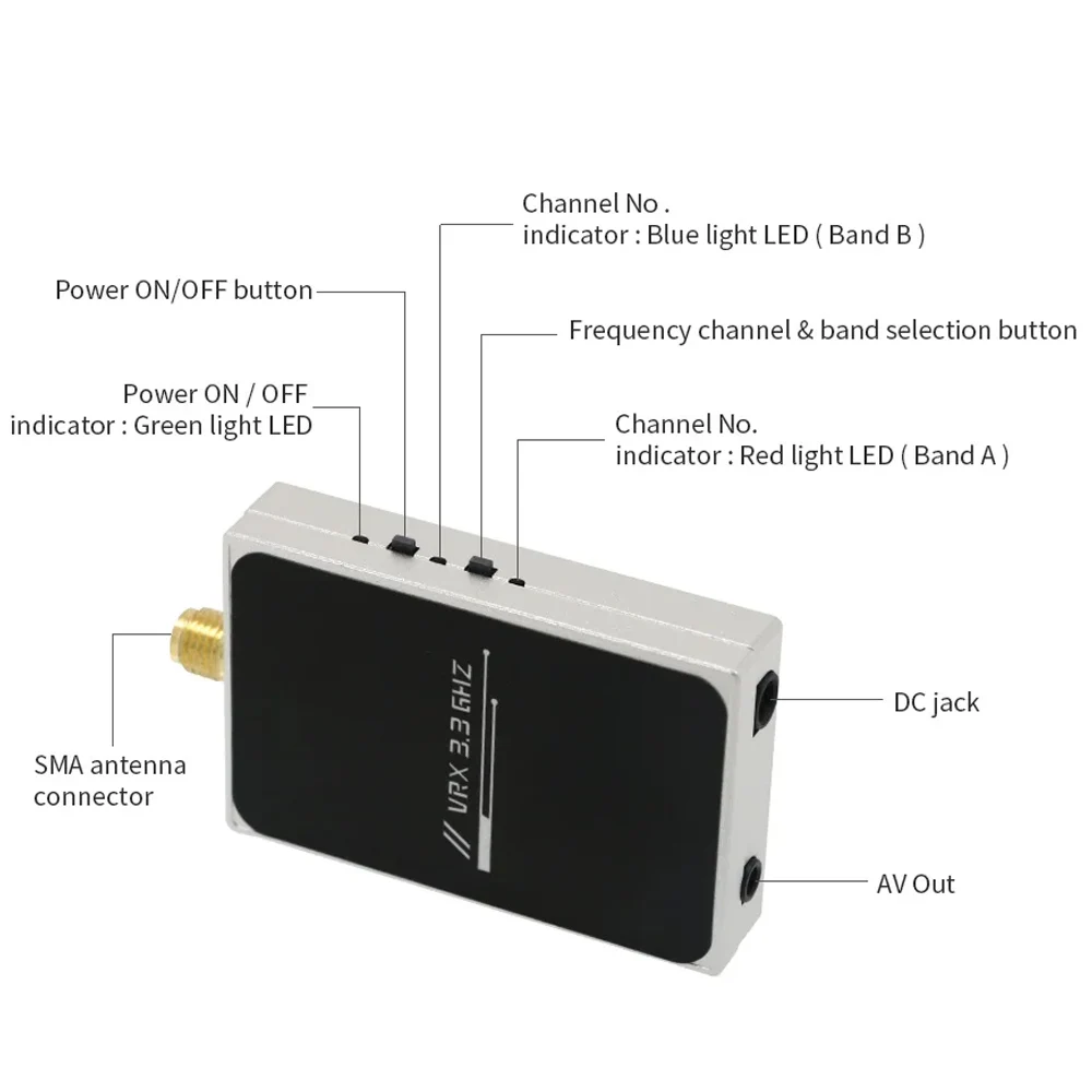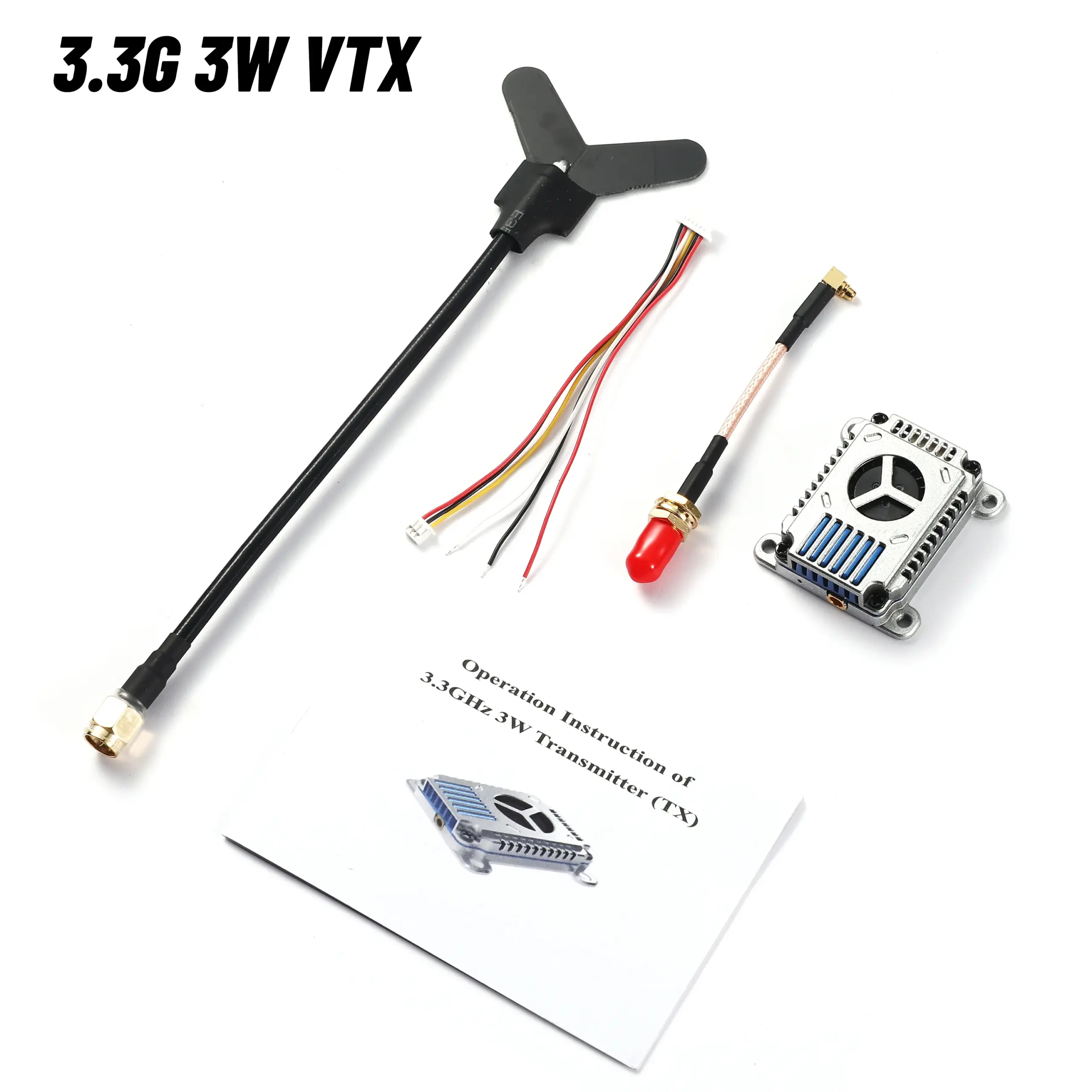 The 3.3G 3W VTX and VRX set is engineered for long-range FPV applications in drones and quadcopters. The VTX features a compact black metal casing (37.7mm x 36.1mm x 11mm, 16g) with a built-in microphone, supporting PAL/NTSC cameras, and offers 16 selectable channels. It operates on 6-36V with power options of 25mW and 3000mW, while a removable SMA antenna enhances transmission capabilities. The VRX boasts a receiving frequency of 3320MHz to 3495MHz, input voltage of DC 7-36V, and a sensitivity of -95dBm. Its features include button control, LED indicators, and an onboard 5V @ 1A regulator output. Perfect for racing drones and remote control vehicles, this set ensures reliable and efficient performance.