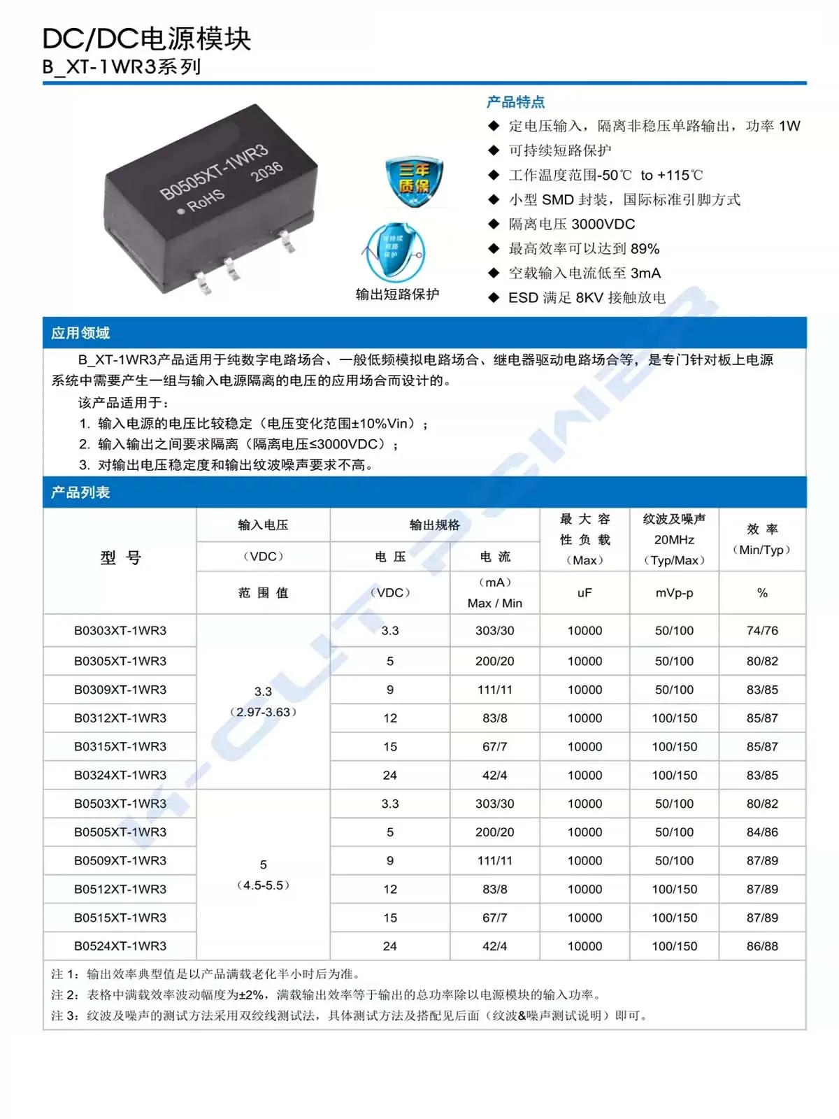The B0303XT-1WR3 DC-DC power supply module delivers a stable 3.3V output with a maximum current of 303mA and a power output of 1W. Its compact, rectangular design features a sleek matte black finish, with crisp white printed text indicating the model number and compliance markings. The module includes three shiny silver pins for secure soldering onto circuit boards, making it ideal for precise electronic applications. Its simple, functional aesthetic emphasizes efficiency and technical sophistication, supporting customizations for various projects. Designed as a high-quality voltage regulator, this module ensures reliable performance in power management systems requiring a steady 3.3V output.