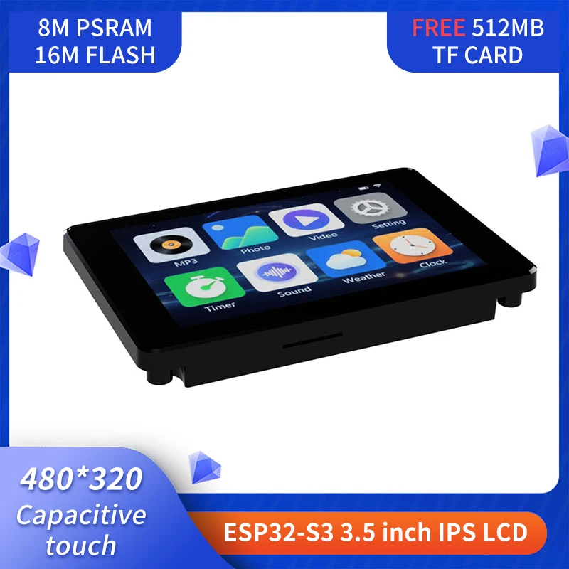 Experience vibrant visuals with this 3.5-inch IPS TFT capacitive touch screen featuring a 480×320 resolution and 65,000 RGB colors, housed in a sleek glass panel with a slim black bezel. Powered by an ESP32-S3 dual-core microcontroller running up to 240MHz, it includes 8MB PSRAM and 16MB flash memory, supporting WiFi and Bluetooth connectivity. Ideal for LVGL development, this display is designed for lithium battery-powered projects, offering a modern, high-contrast interface with wide viewing angles. Its compact, stylish design integrates seamlessly into embedded systems, making it perfect for innovative IoT applications and user interface projects.