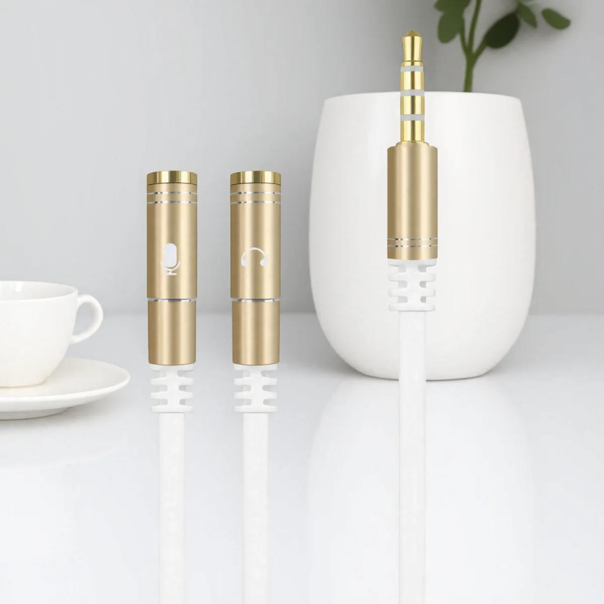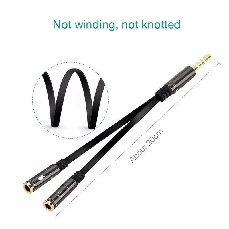 Experience seamless audio and microphone connection with this sleek splitter cable designed for modern devices. Its minimalist, cylindrical matte black body is accented with shiny gold-colored bands near the top, adding a touch of elegance. The white icons clearly indicate its function, making it easy to identify. Perfect for users who want to enjoy high-quality stereo sound while using separate mic and audio connections, this cable turns one combined port into two distinct ones. Whether for professional calls, gaming, or music, it streamlines your setup by enabling compatible wired headsets to connect effortlessly to laptops, tablets, or smartphones. Its compact 20cm length offers flexibility and convenience for daily use, all while maintaining a refined and modern aesthetic.