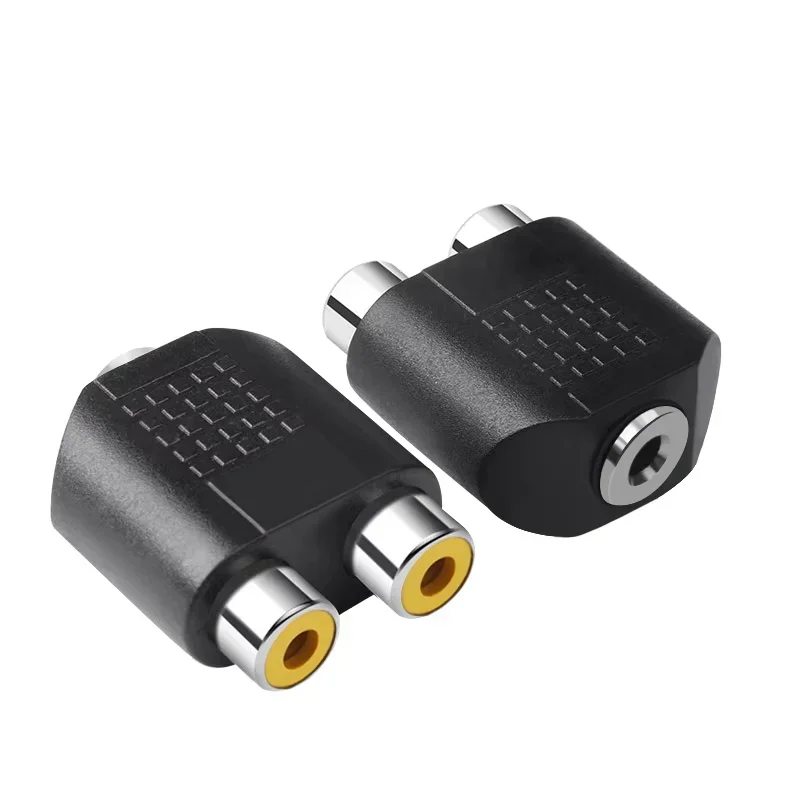 Imagine effortlessly linking your favorite audio devices with the sleek design of this this 3.5mm stereo female to dual RCA male adapter. Its durable black body features textured surfaces that ensure a firm grip during installation. The device offers a modern, minimalist look with a combination of rectangular and cylindrical components, like the shiny silver RCA ports and gold-colored sockets. It provides reliable signal conversion, enabling seamless connection between smartphones, tablets, computers, and professional audio equipment. Whether you need stereo or mono compatibility, this adapter accommodates your setup. Available in packs of 5 or 20 pieces, it’s perfect for both casual use and professional environments, ensuring high-quality audio transfer consistently and securely.