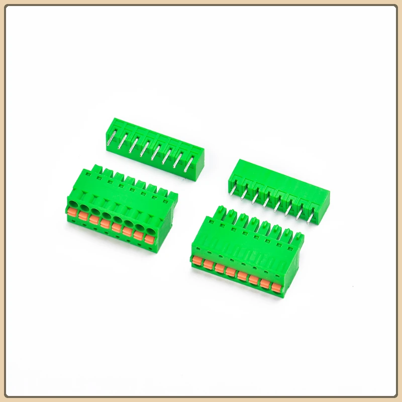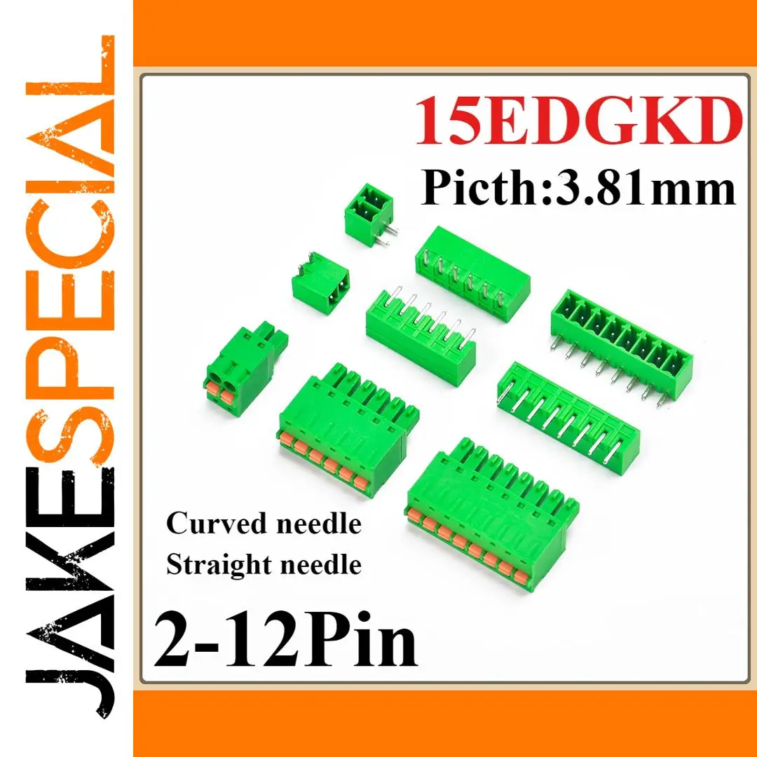 Imagine a seamless connection in your electronic projects with this high-quality 3.81mm pitch spring-type female and male pluggable PCB terminal block. Designed for durability and efficiency, these connectors allow quick wiring and robust electrical contact, ensuring your devices perform reliably. With options ranging from 2P to 12P, including configurations with straight or curved pins, you can customize your setup to fit precisely. The vibrant green housing makes it easy to identify and troubleshoot, while the gold or nickel-plated contacts guarantee high conductivity. Suitable for various wire sizes (28~12AWG) and capable of handling voltages up to 220V or 300V, these connectors are perfect for electrical and electronic applications where safety and durability are paramount.