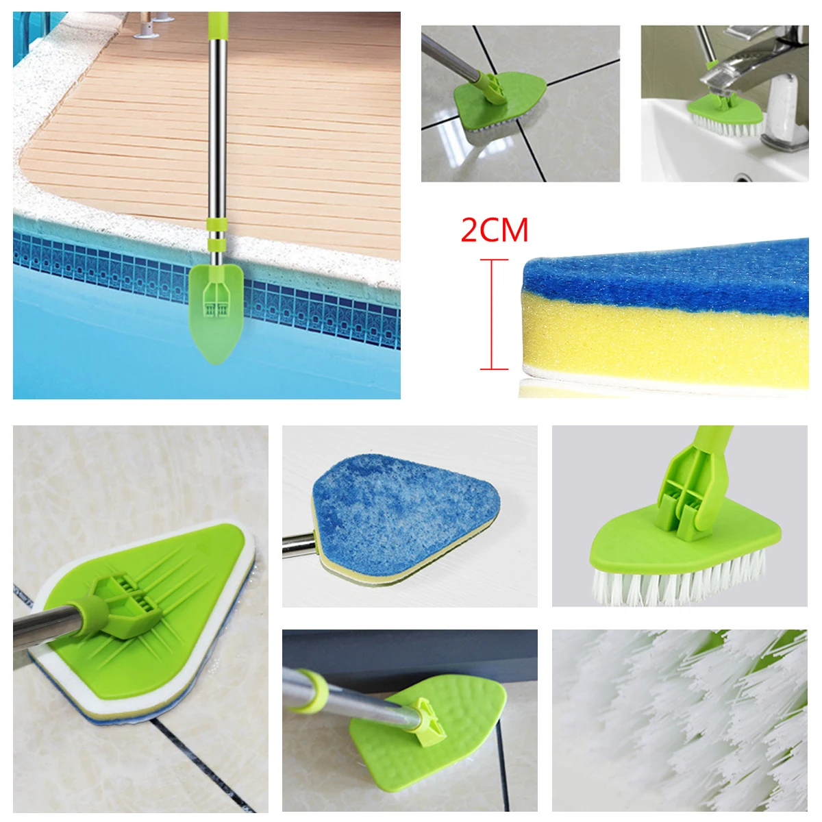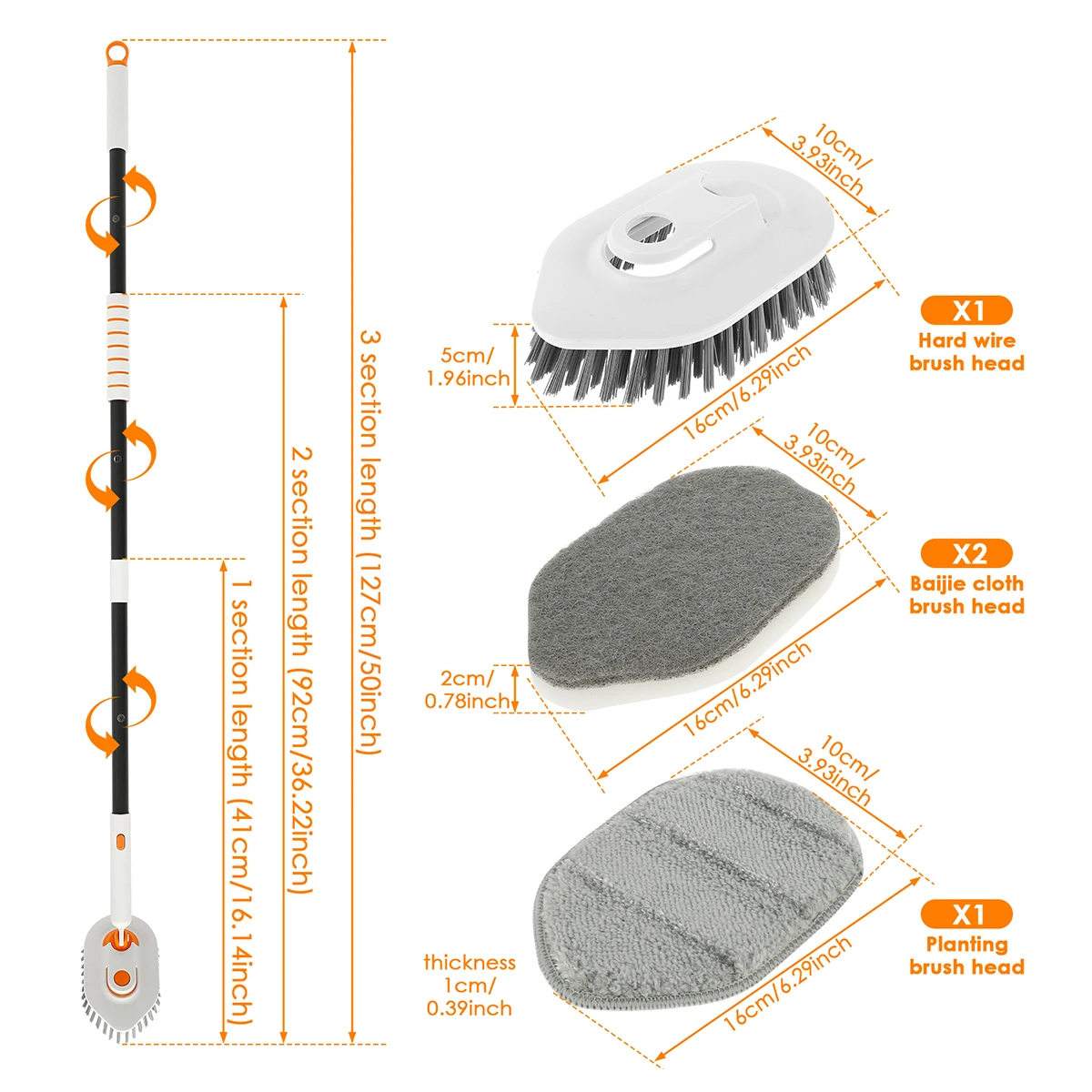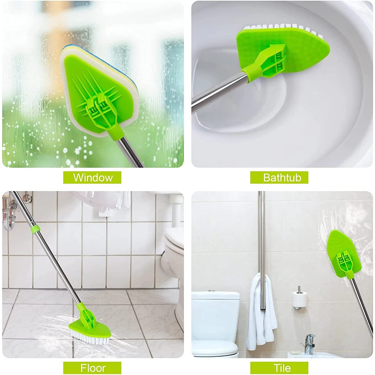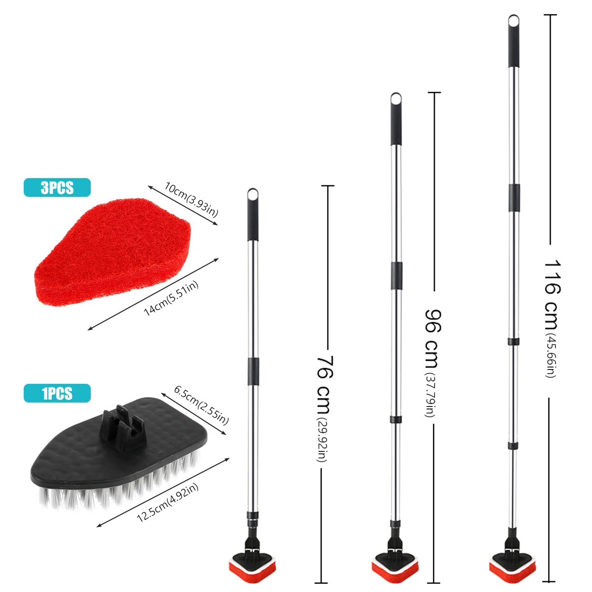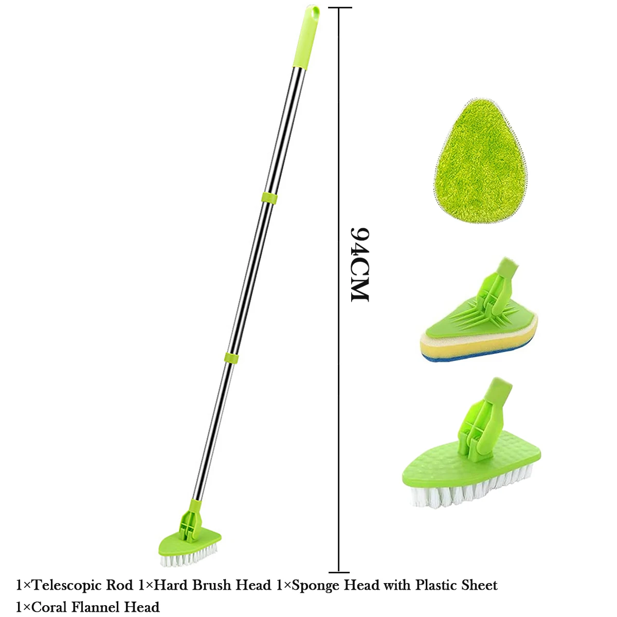 Experience the ultimate cleaning convenience with this this 3-in-1 long handle tile scrubber, designed for seamless household cleaning. Its sleek, modern design features a metallic handle accented with vibrant green elements that add a pop of color and visual appeal. The handle extends from 46cm to 72cm with two sections, and up to 94cm with three sections, locking securely via a clockwise turn. The 180° rotatable head allows you to easily clean at various angles, especially in tight corners and hard-to-reach spots. This multifunctional tool comes with three removable heads: a stiff bristle brush, a sponge with plastic sheet, and a soft coral fleece, making it perfect for tiles, floors, grout, glass, and walls. It combines aesthetic appeal with agility, ensuring your cleaning tasks are simple and effective.