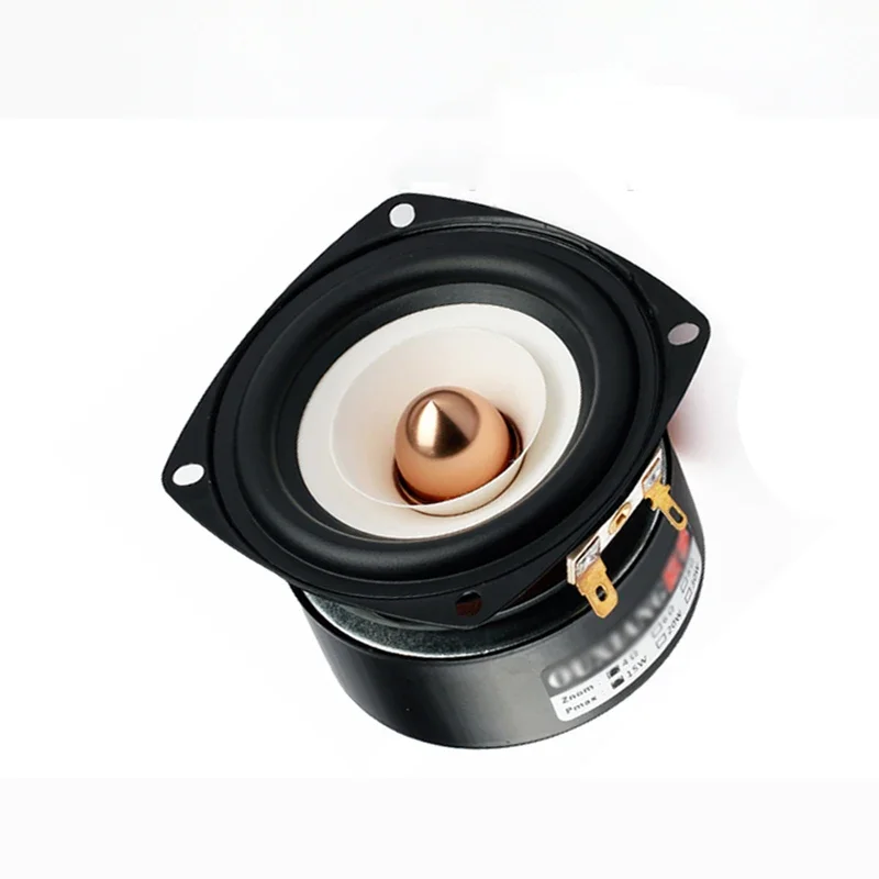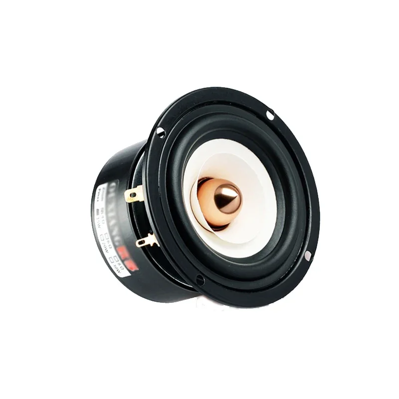 Imagine upgrading your home audio or DIY project with this exceptional 3-inch full-range speaker. Its sleek metal enclosure and modern black finish offer a professional look that seamlessly blends into any setup. The crisp, white paper cone with a unique formula ensures smooth, natural sound that brings musical details to life. The metallic-colored dome in the center adds a touch of elegance, while the imported German rubber edging guarantees durability and consistent movement. Featuring a copper short-circuit ring to amplify high frequencies and reduce harmonic distortion, this speaker offers broad, balanced frequency response. Easy to install and compatible with various devices, it provides high-fidelity audio for home theater, DIY audio projects, or custom speaker builds.