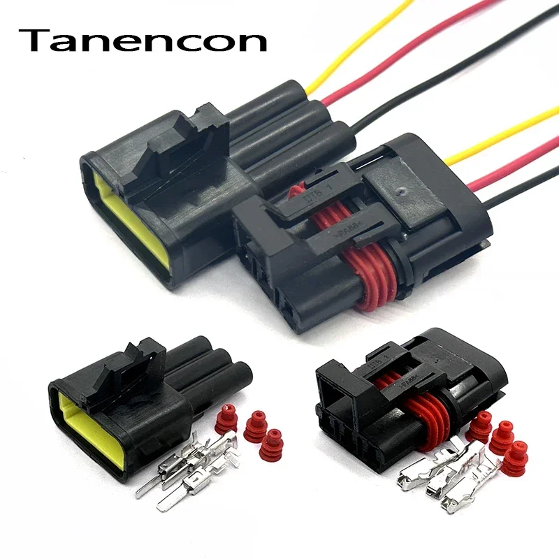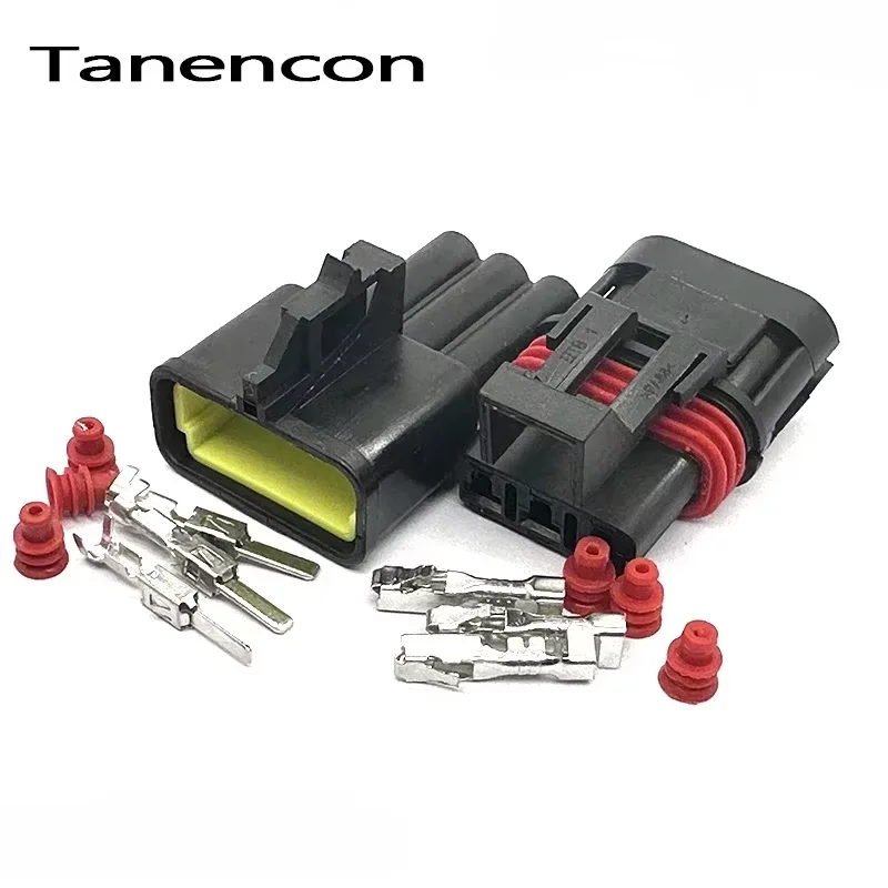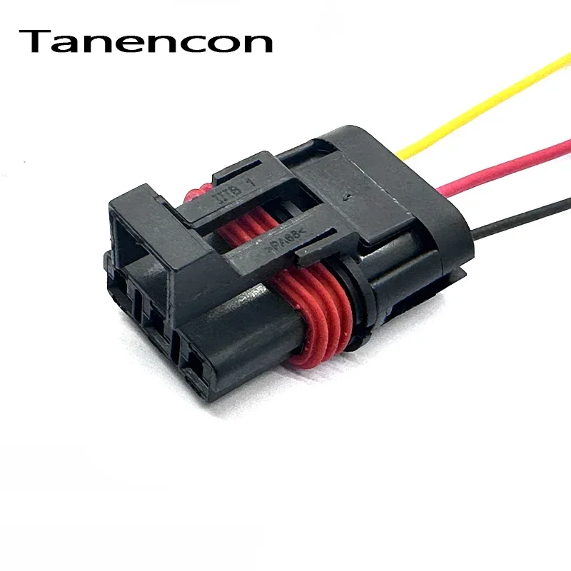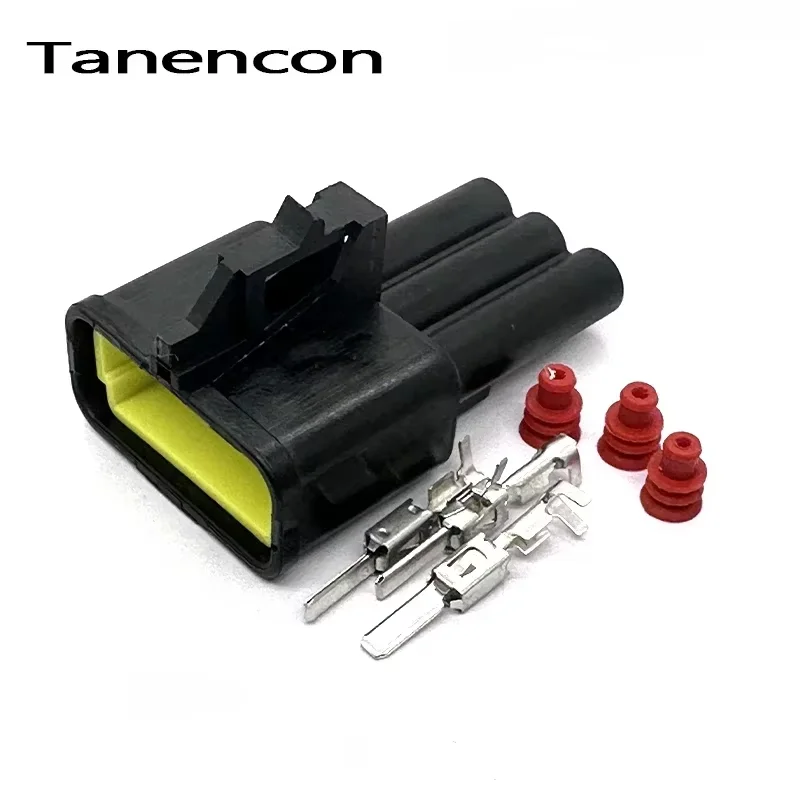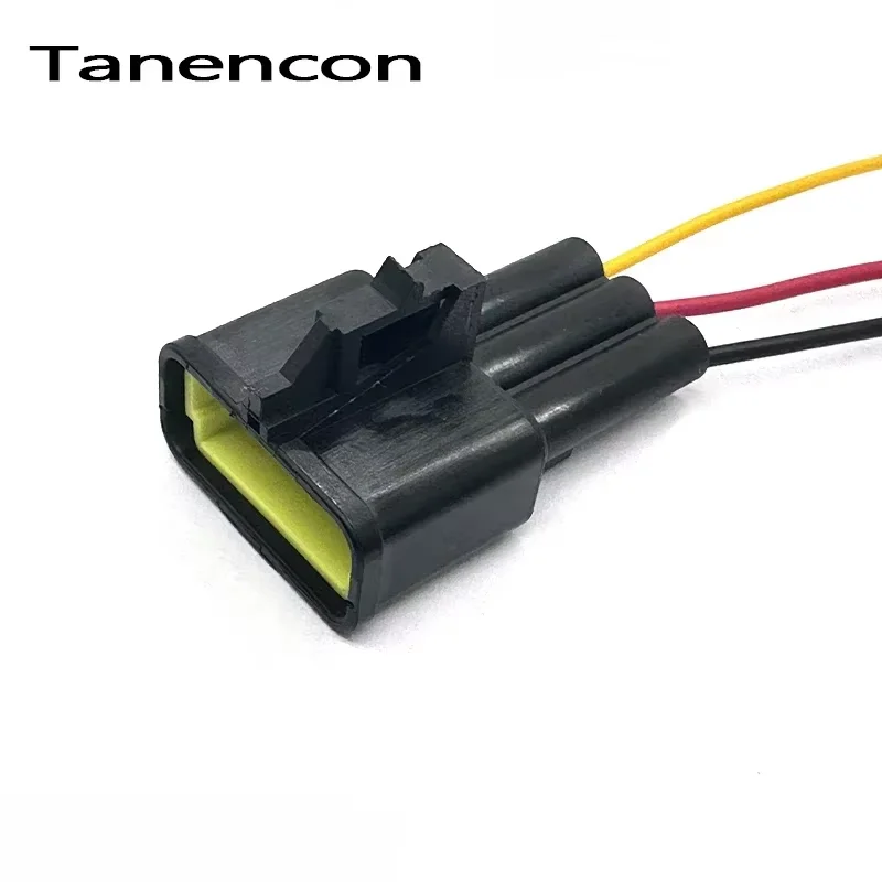 Introducing the 1 Set of 3 Pin Male and Female 280 Series Sealed Plastic Wiring Harness Auto Connectors by JYCLC, designed specifically for automotive applications, including compatibility with Polaris models. Made from high-quality black plastic, these connectors feature a smooth surface and incorporate a striking bright yellow insert for easy connection visibility. Each connector has a secure locking mechanism, ensuring reliable electrical connections. The female connector is equipped with three exposed wires—red, yellow, and black—arranged for durability and efficiency. This compact and robust wiring harness set guarantees effective performance in any automotive setting. Available in quantities of 1 Set or 5 Sets.