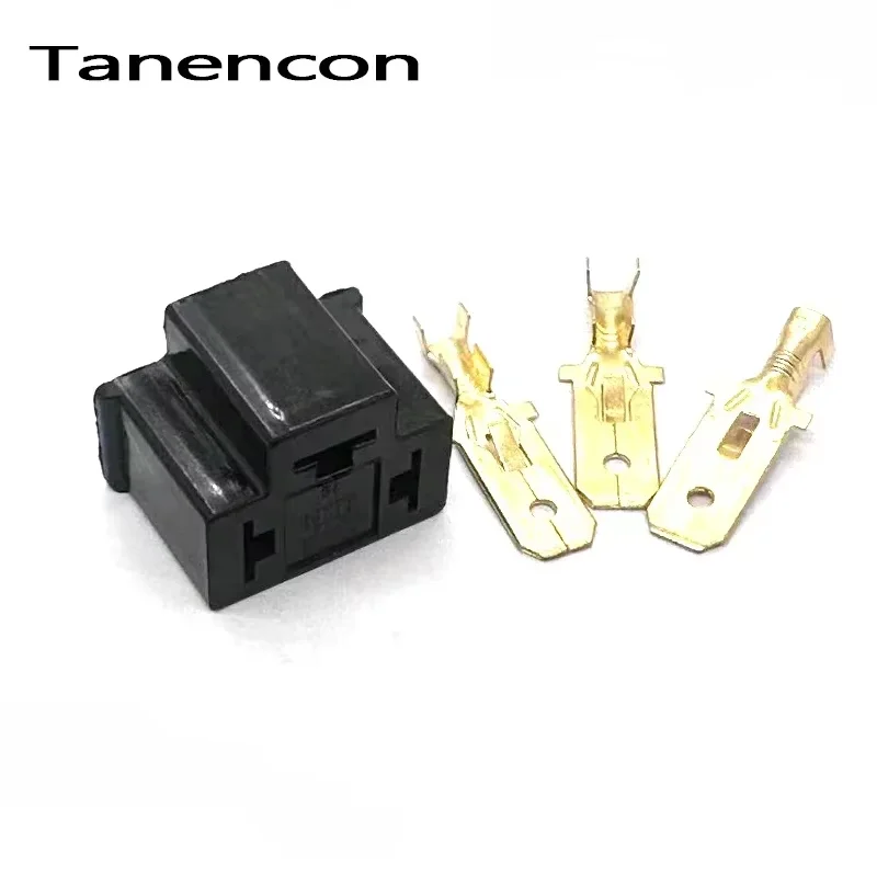 Enhance your automotive lighting with the 3-pin car lamp holder connector plug, expertly designed for lamp modifications, specifically compatible with Hernia Lamp and H4 Lamp motorcycle headlights. Crafted from durable black plastic, this connector ensures a solid and secure fit with distinct shapes for easy connection. It features three gold metallic terminals that enhance conductivity, each with a flat and tongue-like design for versatile wiring options. Equipped with waterproof plugs, this connector guarantees reliable performance in various conditions. Choose from available quantities of 1 set, 5 sets, or 10 sets to best suit your needs.