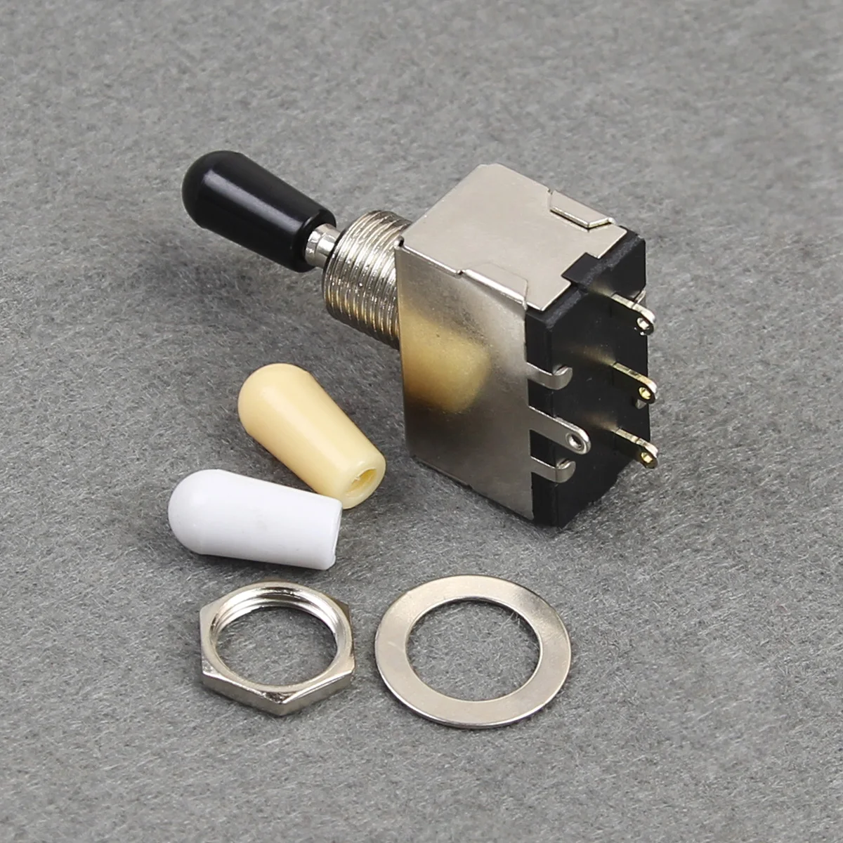 - Technical specifications include a switch body made of high-grade metal, plastic caps for customization, phosphor-copper silver-plated contact plate, and compatibility with most electric guitar wiring systems.