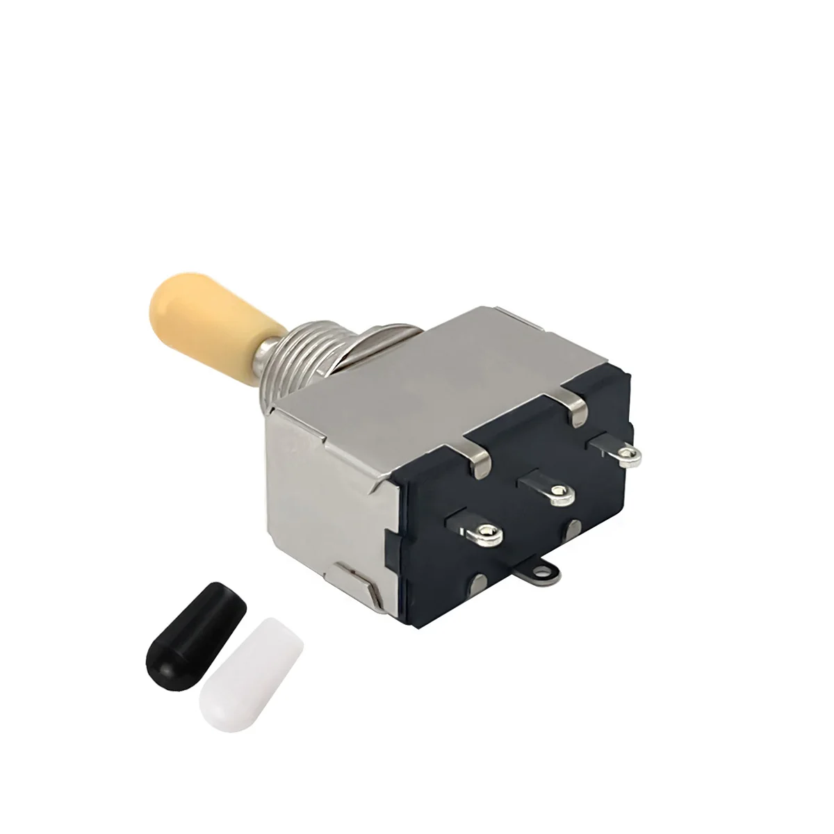 Experience seamless control over your electric guitar with this high-quality 3-way toggle switch. Featuring a sleek, box-style design, its chrome-colored body adds a modern touch to your instrument. The switch has a durable metal and plastic construction, ensuring longevity and reliability. The threaded metal shaft is topped with a smooth, beige plastic tip, providing comfortable grip and easy operation. Included are two additional tips—one glossy black and one pristine white—allowing you to customize your look. The switch’s silver-plated phosphor-copper contact plates ensure excellent electrical conductivity and corrosion resistance. Designed for easy installation, this switch is compatible with various guitar wiring setups, making it a preferred choice for musicians seeking functionality and style.