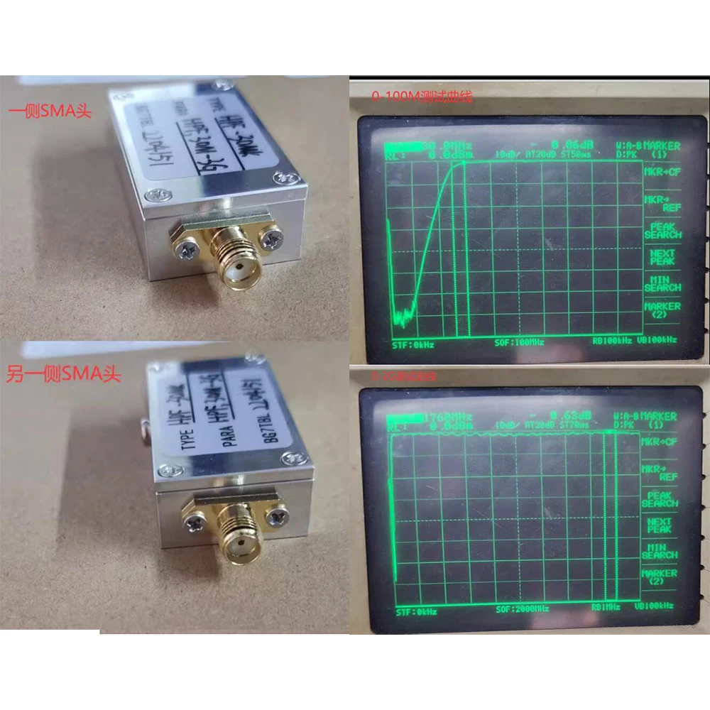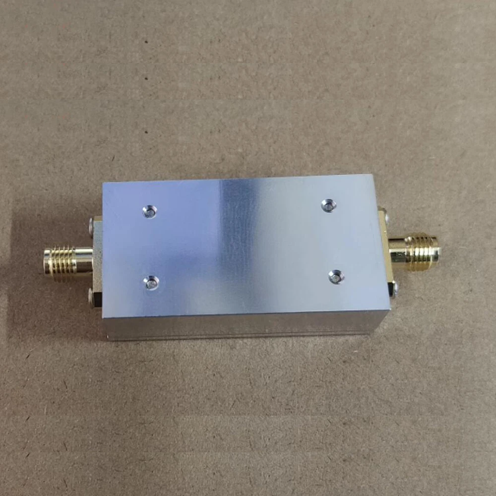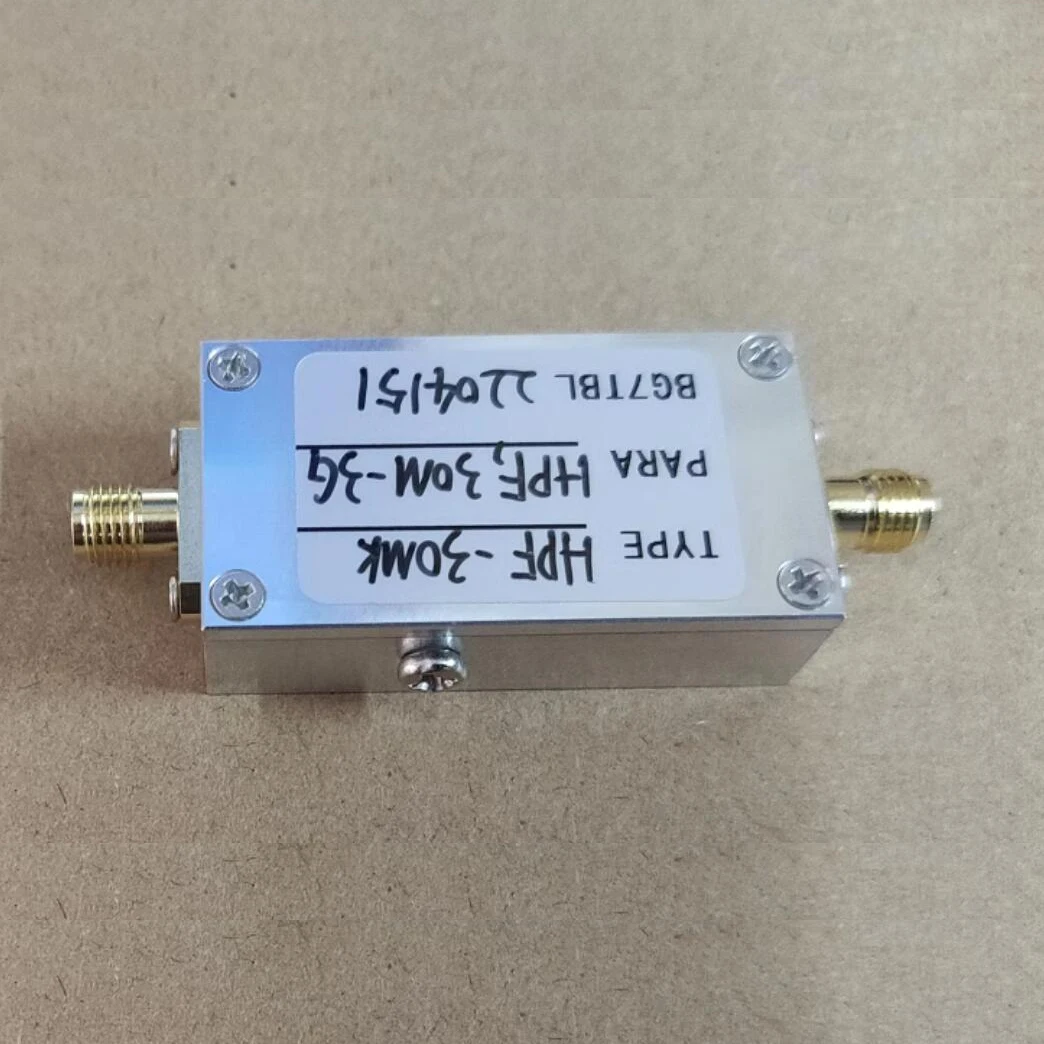 This high-pass filter features a sleek rectangular metal body with a polished, metallic finish, measuring 62 mm in length, 25 mm in width, and 12 mm in height, weighing around 30 grams. It has SMA female connectors on each side for secure RF signal connection and operates over a frequency range of 30 MHz to 3 GHz. The device provides insertion losses of 0.5 dB from 30 MHz to 50 MHz, 1 dB from 500 MHz to 2 GHz, and 3 dB from 2 to 3 GHz. Supporting a maximum power of 20 dBm and with a 50-ohm impedance, it offers durable, professional-grade performance suitable for SDR systems, GPS, Wi-Fi, drone, and other high-frequency applications.