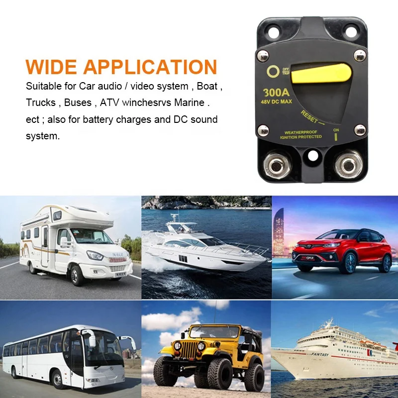 Experience secure, high-current electrical protection with this durable, compact fuse holder designed specifically for demanding DC systems. Its sleek rectangular shape boasts a matte black finish that exudes industrial strength and reliability. The integrated yellow reset switch is both functional and easy to locate, adding a bold visual cue to its practical design. With smooth, slightly curved sides, it combines ruggedness with streamlined aesthetics—ideal for marine, RV, truck, trailer, and solar power applications. Large metallic terminals with hexagonal nuts ensure secure connections capable of handling up to 300A at 48V DC. Whether you're installing in tight spaces or heavy-duty environments, this fuse holder delivers high performance, weatherproof protection, and peace of mind that your electrical system remains safe during overload or short circuit conditions.