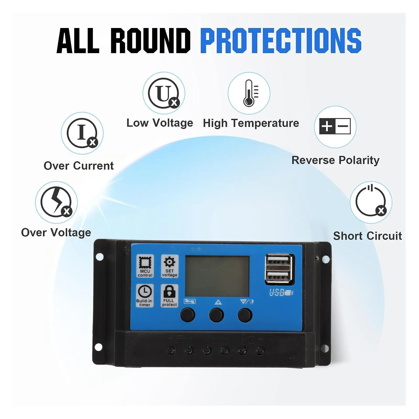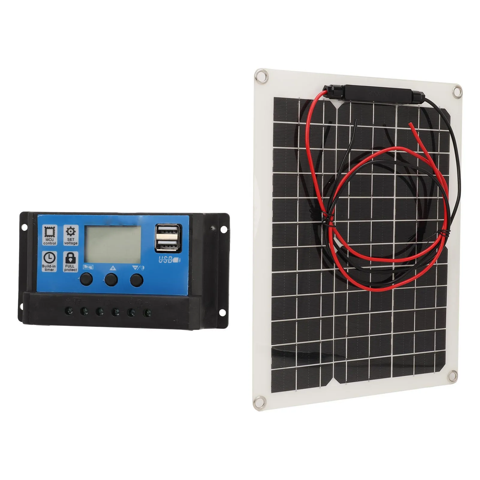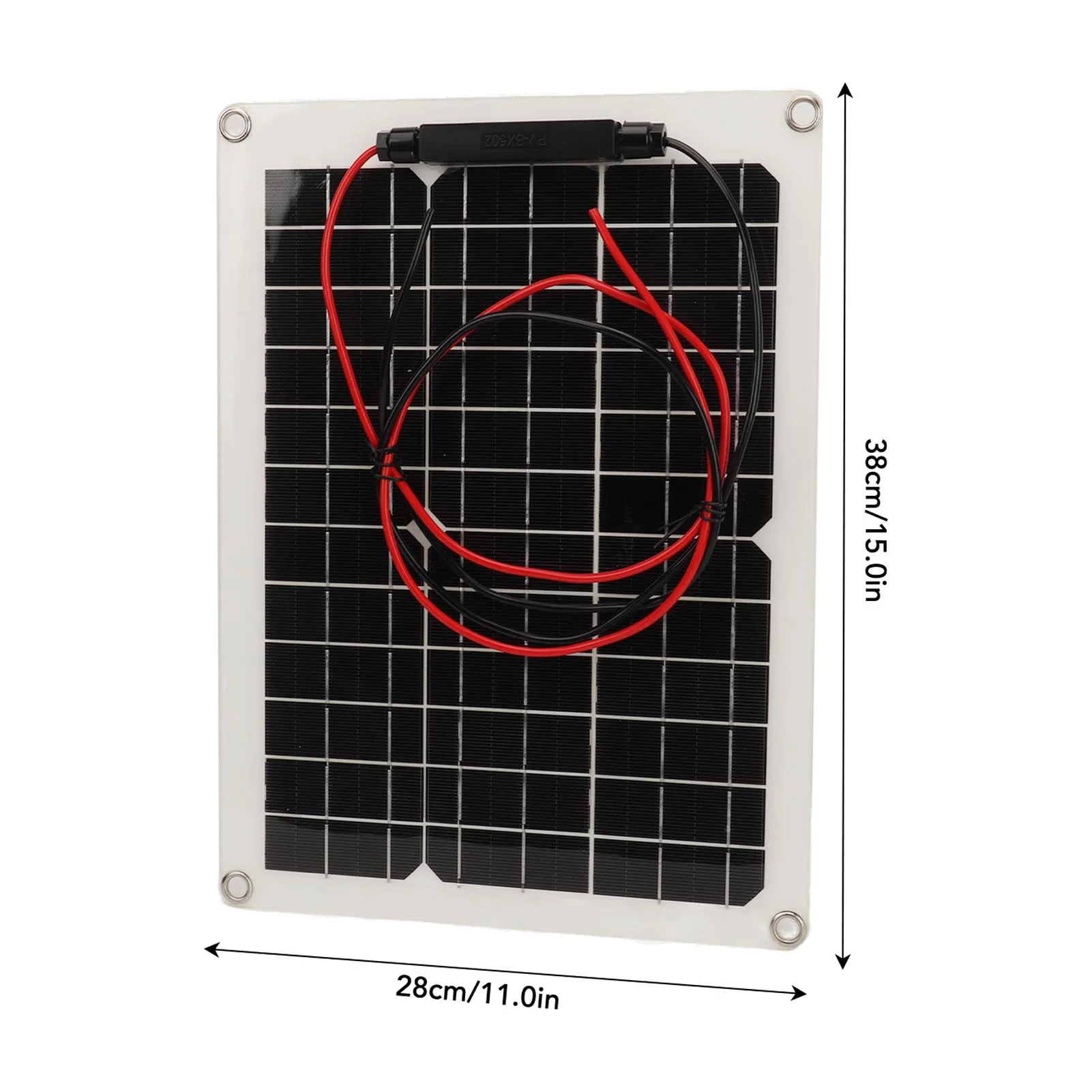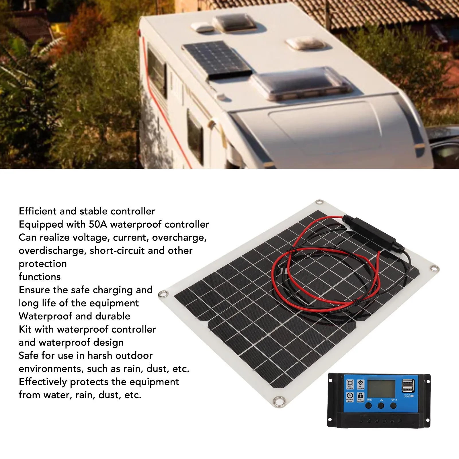 Experience reliable, eco-friendly power with this 300W solar panel kit, designed for outdoor use in RVs, campers, and off-grid applications. The sleek rectangular solar panel measures approximately 28×38 cm (11.0×15.0″) and features a durable, waterproof ABS construction with a modern black photovoltaic grid pattern framed by a clean white border. It includes a 50A waterproof charge controller with protective functions for voltage, current, overcharge, and short circuits, ensuring safe and stable operation in all weather conditions. The kit is lightweight at 657 grams (1.4 pounds) and includes four accessories and an instruction manual for easy setup, making it your ideal renewable energy solution outdoors.