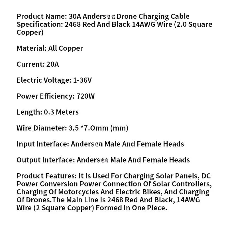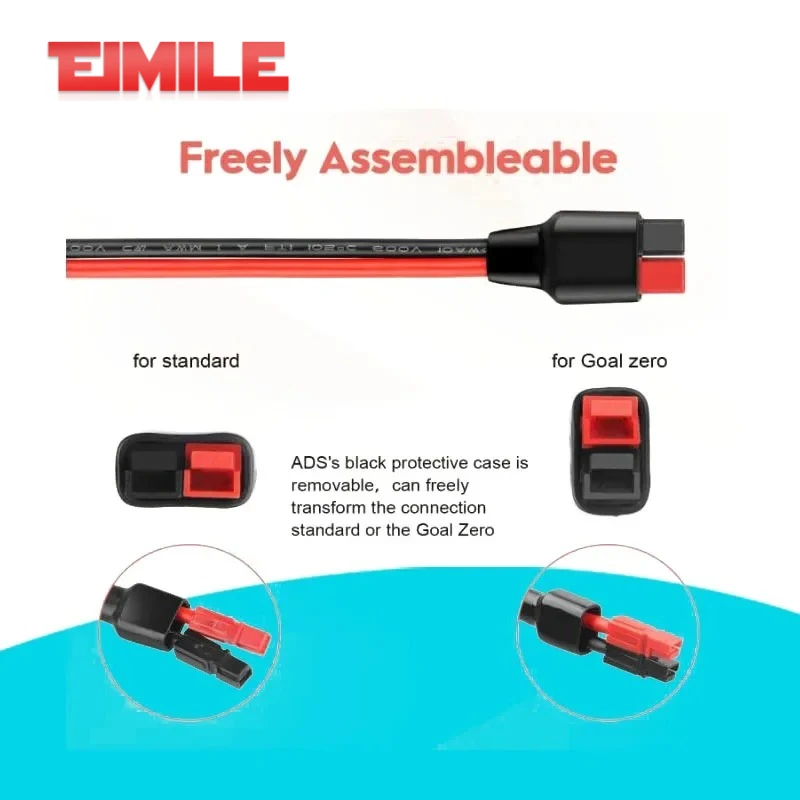 Experience reliable power connections with this 30A Anders Connector, featuring 14 AWG wires and a 0.3-meter (30 cm) length, designed for outdoor solar panel and battery applications. The male-to-female rectangular connectors, constructed for durability, are ideal for portable RVs and electric vehicles, supporting 1 to 2 power lines for efficient high-current transfer. The striking black casing with red locking elements ensures secure, weather-resistant connections, while the color-coded red and black wires provide clear polarity identification. Built with outdoor resilience in mind, this rugged, practical connector offers a dependable solution for your electrical setups, combining robust design with easy, secure installation.